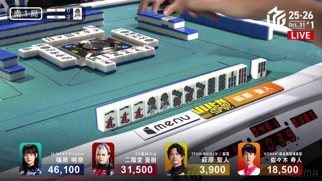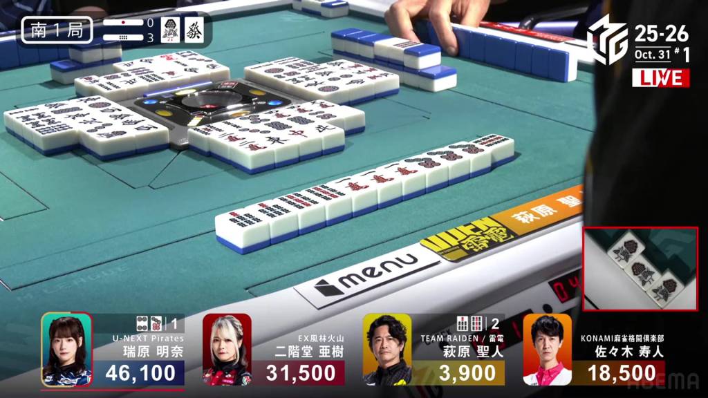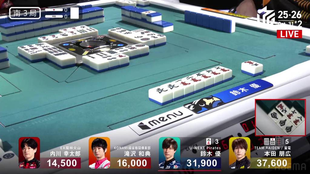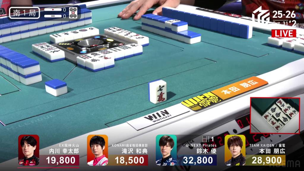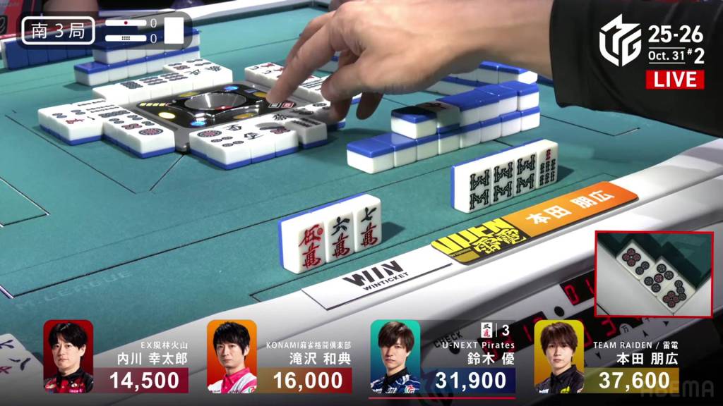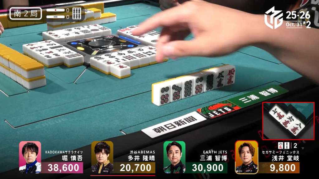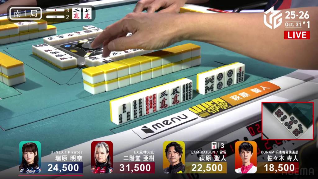 Because of the riichi stick, Hori’s winning conditions have changed. Any haneman ron will be enough for Hori to move into 1st, meaning a 1p or 4p ron will be enough, and a 7p ron will need only one booster to get there.
