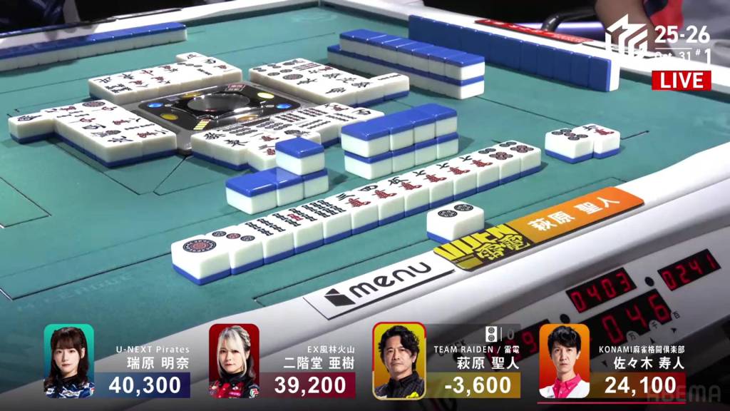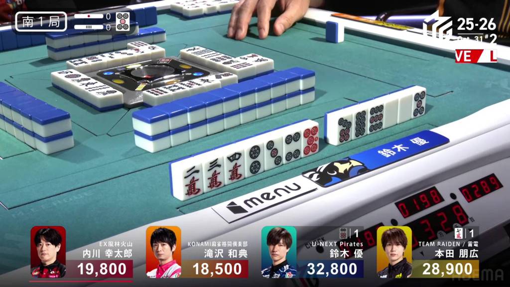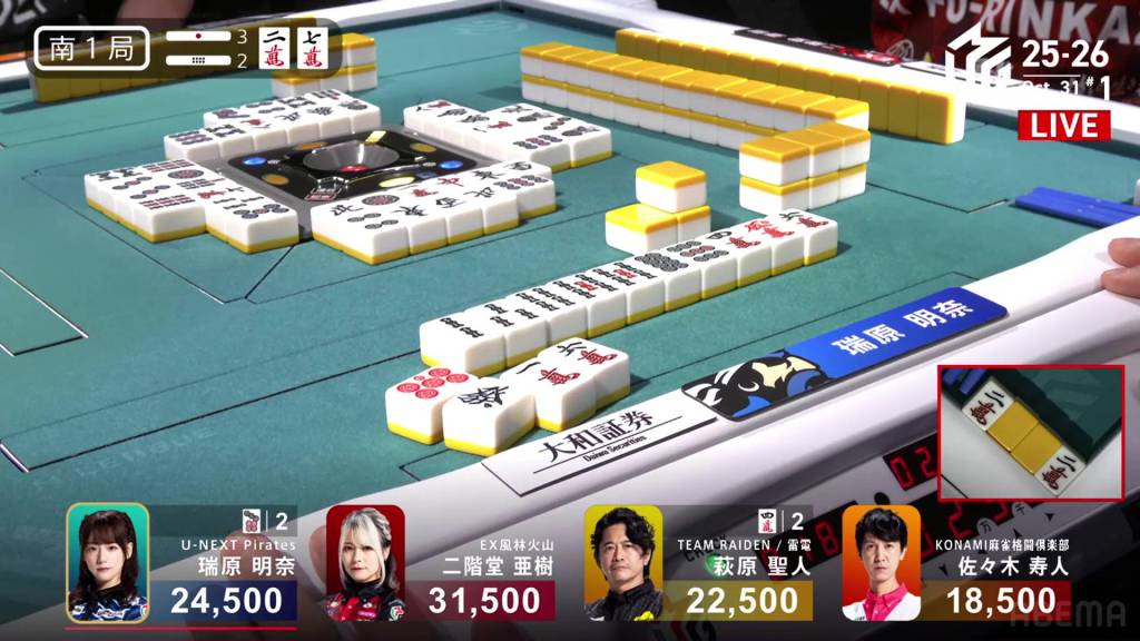 In S1-2, Mizuhara is the dealer in 2nd place and is 7,000 behind 1st place Aki. Wih three riichi sticks and two honba, the next winner will get a sizeable boost to their score.