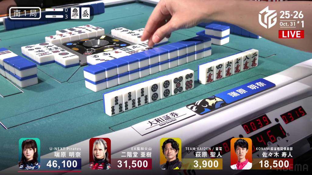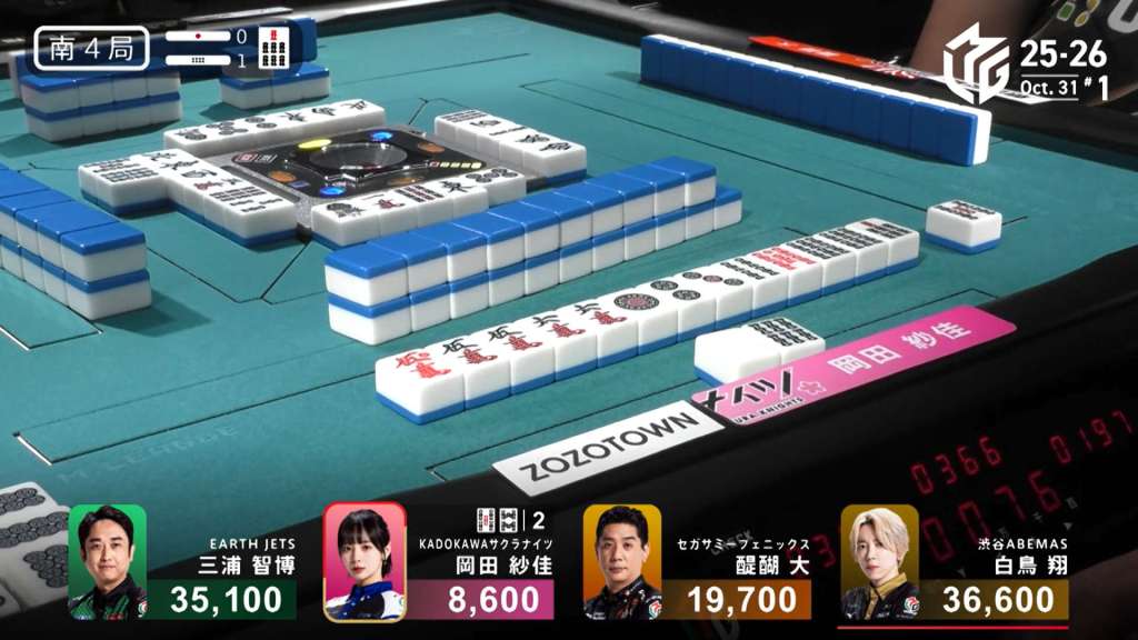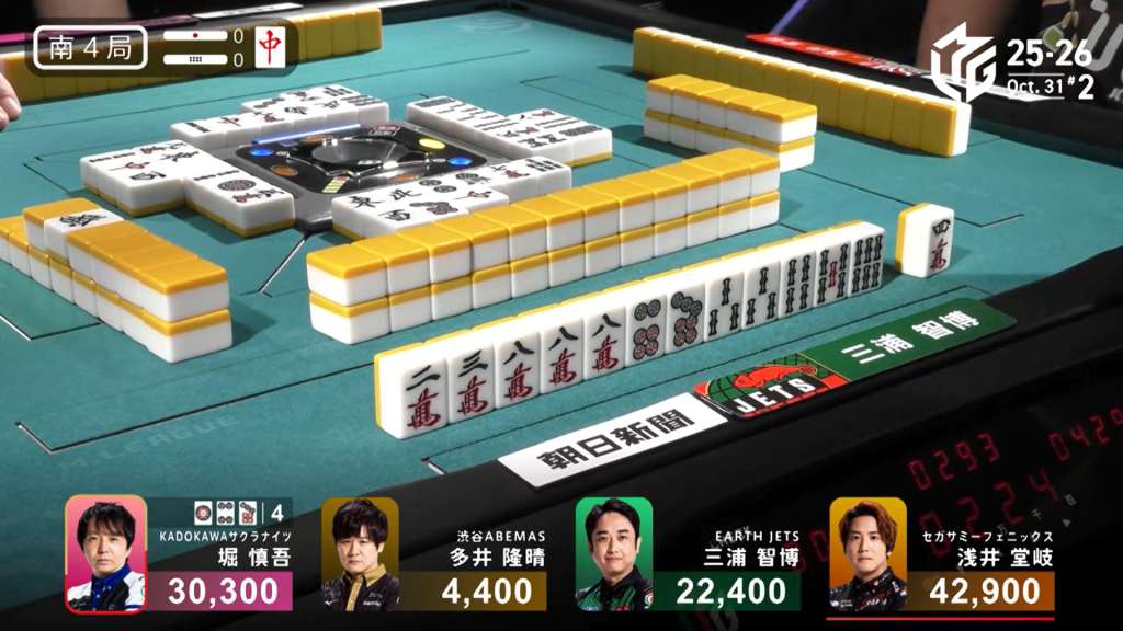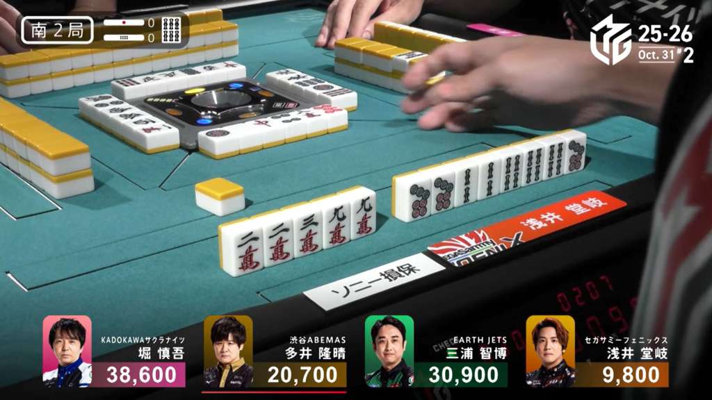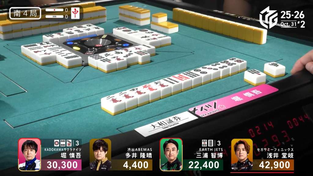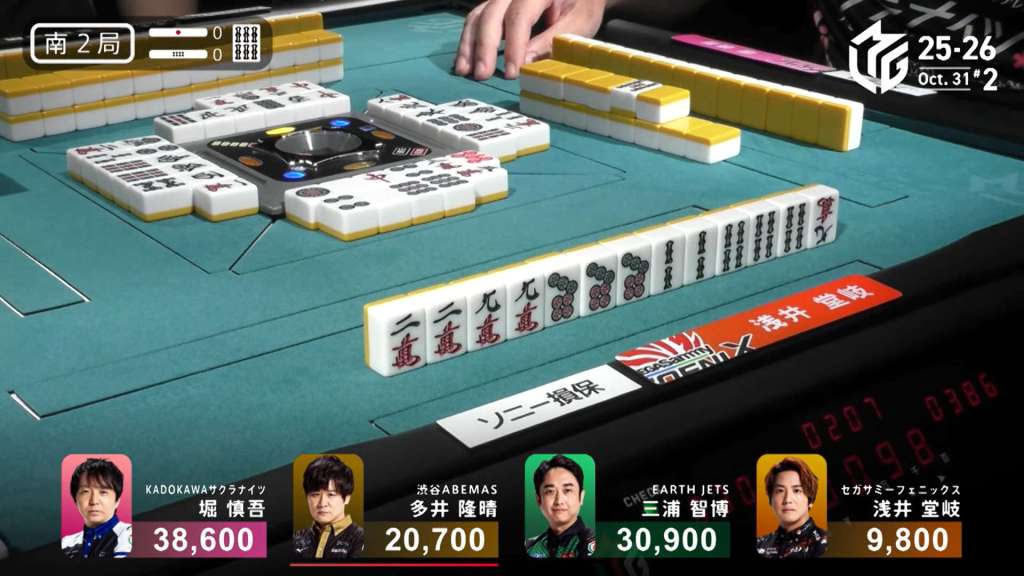 In S2-0, Takaki is in 4th place, 10,900 behind 3rd place dealer Ooi, 21,100 behind 2nd place Miura and 28,800 behind 1st place Hori. With the Sega Sammy Phoenix at the bottom of the rankings, they sorely need a win.