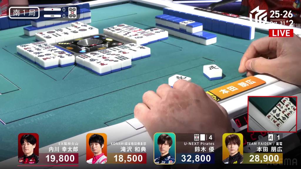 In S4-0, Hori is still in contention for 1st place despite Takaki winning the yakuman. Sitting 12,600 behind dealer Takaki, Hori needs a 3/50 or 4/25 direct hit, a haneman tsumo or a baiman ron.