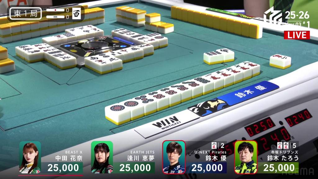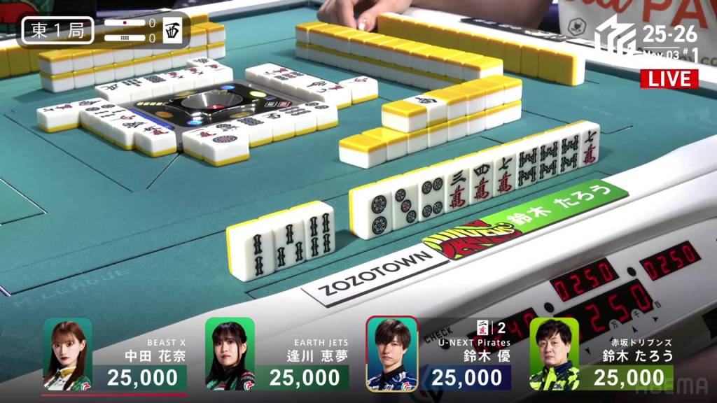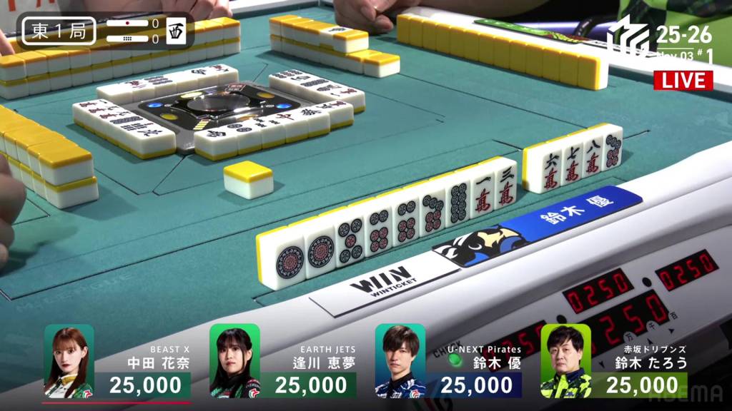 For Yu, he is at risk of drawing a 5m and dealing into Taro, especially since there are three 5m left in the wall. But, luck is on Yu’s side as he draws the 2m in the middle of the second row. With the uradora flip, Yu’s 1p becomes the new dora and doubles his hand’s han value. Yu wins with Riichi/Tsumo/Ura 2 for 2,000/4,000 plus a riichi stick, taking the early lead.