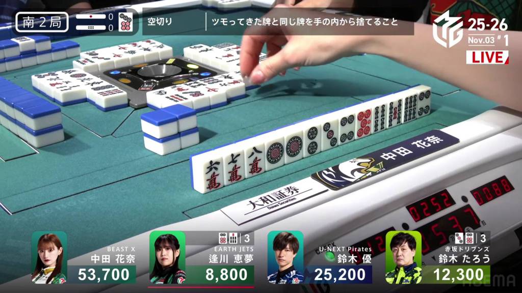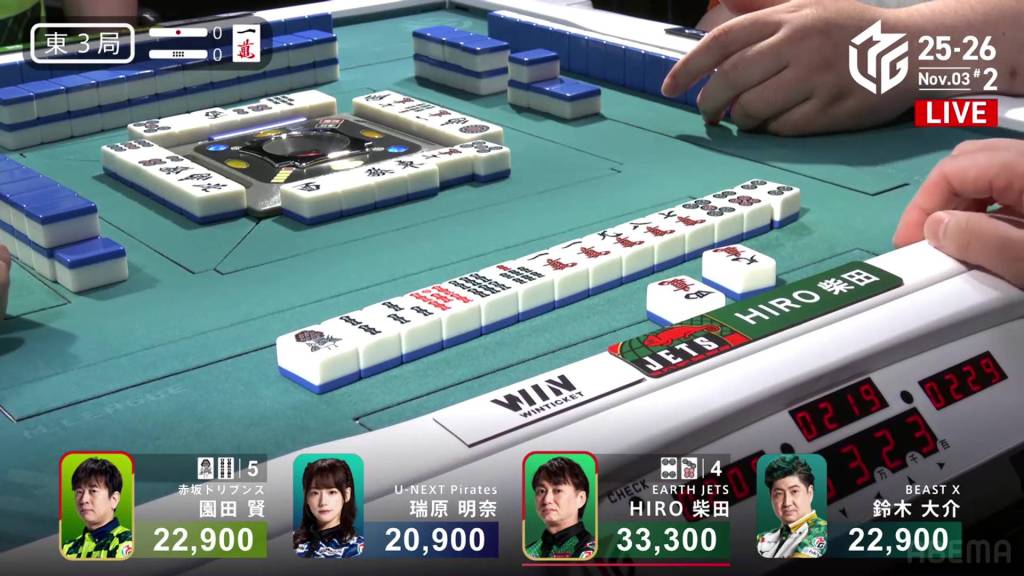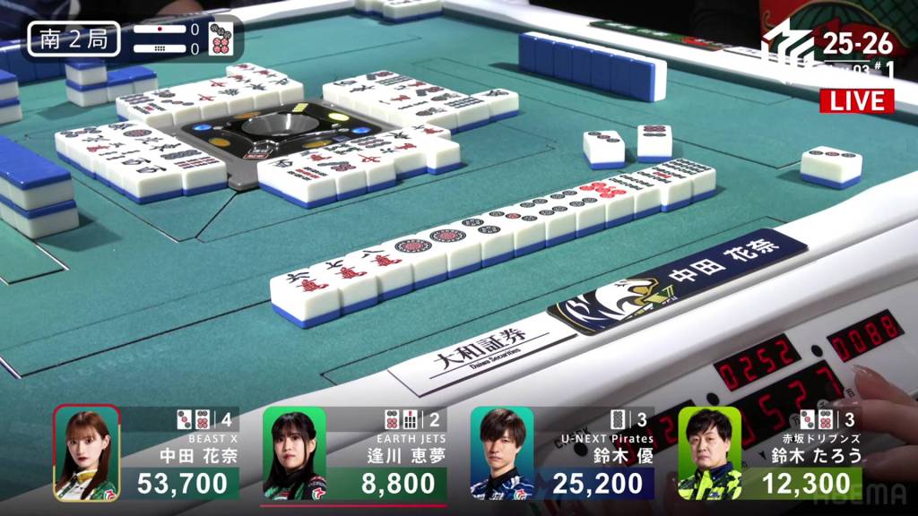 With everyone tenpai with live waits, someone is going to win. On Nakada’s next draw, she gets the 3p and wins the hand. With the uradora flip, Nakada adds two han to her hand to get to a haneman. Nakada wins with Riichi/Tsumo/Pinfu/Aka 1/Ura 2 for 3,000/6,000.