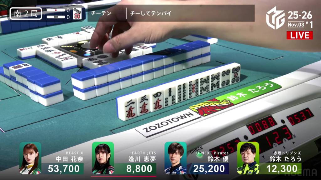Because it took so long for Nakada to advance, other players catch up. At the start of the second row, Taro calls a simple chii and get sto tenpai on a 36p ryanmen.