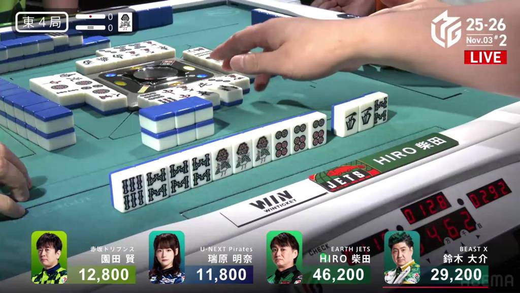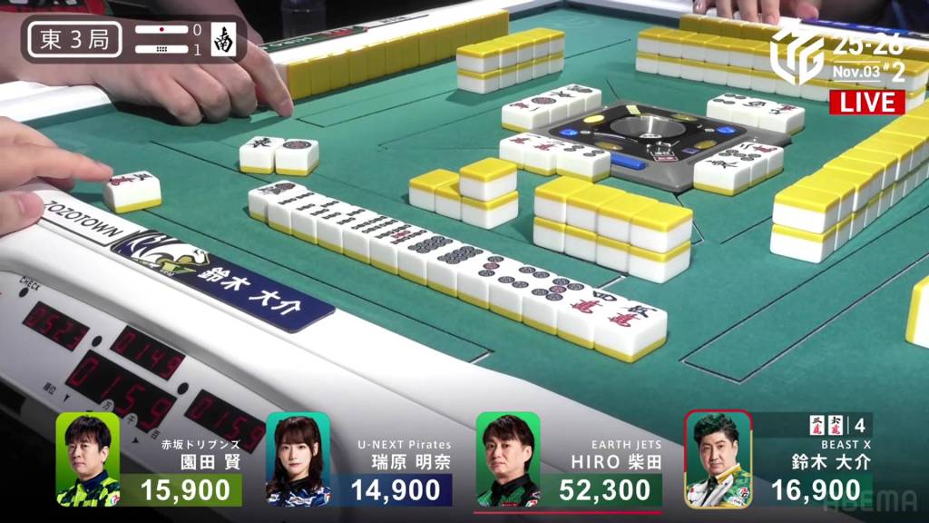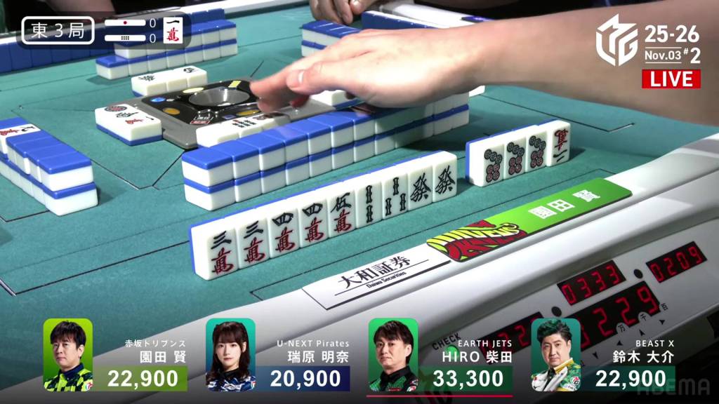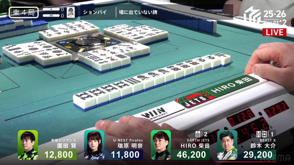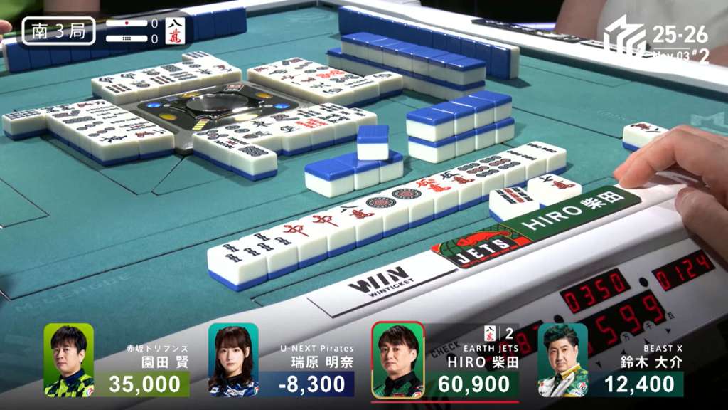 In E4-0, Shibata is trying to make space between him and the advancing dealer Daisuke. Even a single mangan tsumo by Daisuke can drop Shibata’s lead to just 1,000.