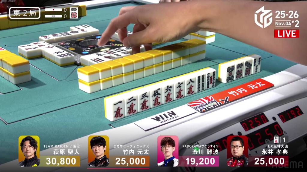 On Nagai’s turn, he draws the 4m and wins the hand. Nagai wins the hand with Riichi/Tsumo/Pinfu/Dora 2/Aka 1/Ura 1 for 3,000/6,000.