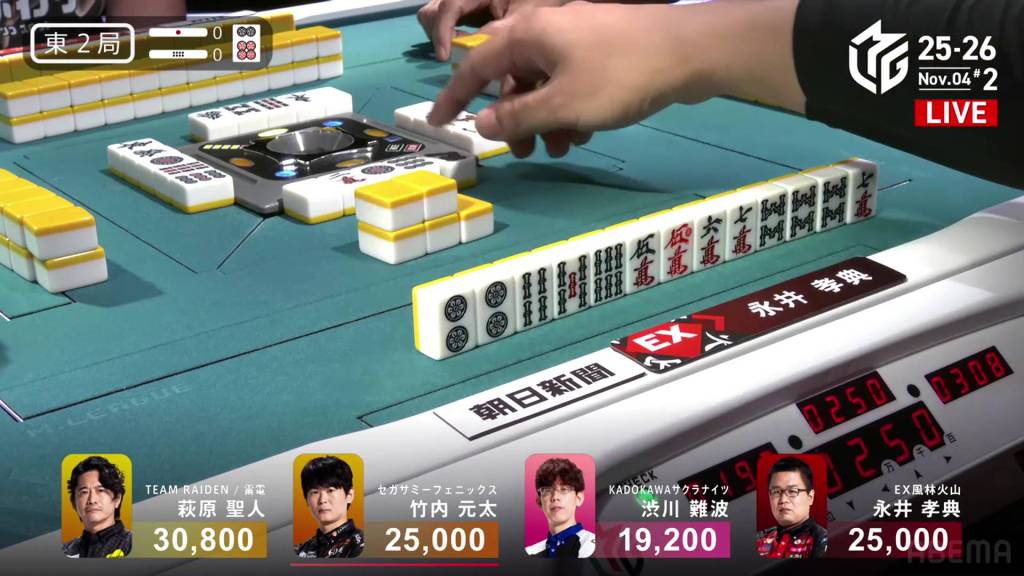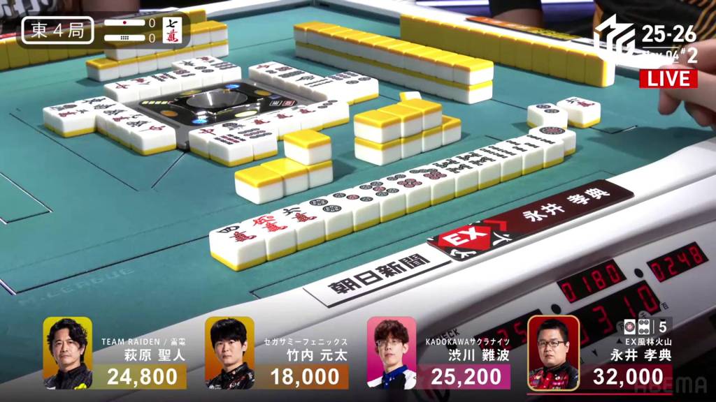 Though there are four winning tiles in the wall, none of them end up coming to him. Through the first row and the second row, he doesn’t get it. During this time, Hagiwara advances his expensive hand with two red fives and a dora 7m. In the middle of the third row, Hagiwara gets to tenpai and calls riichi on a 36m ryanmen, guaranteed at least a mangan.