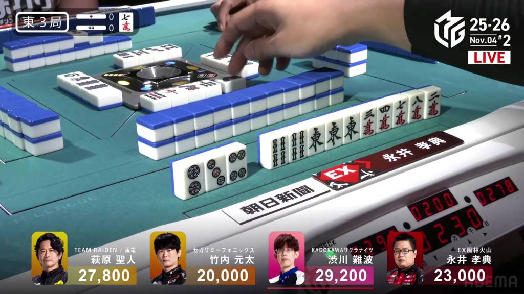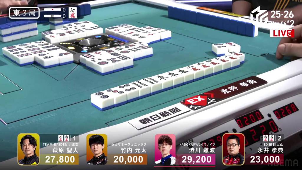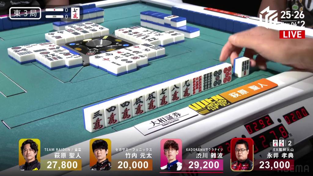 As the turns go along, Shibukawa’s dangerous tiles become safe and he ends up advancing his hand as well. In the middle of the second row, Shibukawa gets to tenpai and stays dama on a 3p kanchan. On his next turn, he decides to make a tsumogiri riichi. The timing ends up being perfect as he draws the 3p on his next turn and wins the hand. Shibukawa wins with Riichi/Ippatsu/Tsumo/Tanyao/Dora 1 for 2,000/4,000 plus two riichi sticks, enough to move into 1st place.