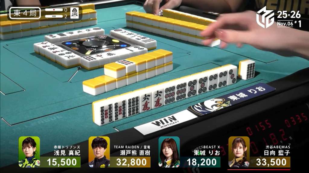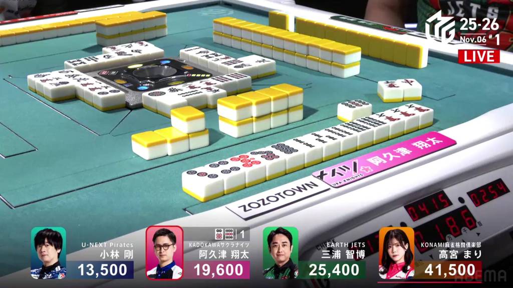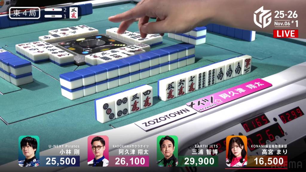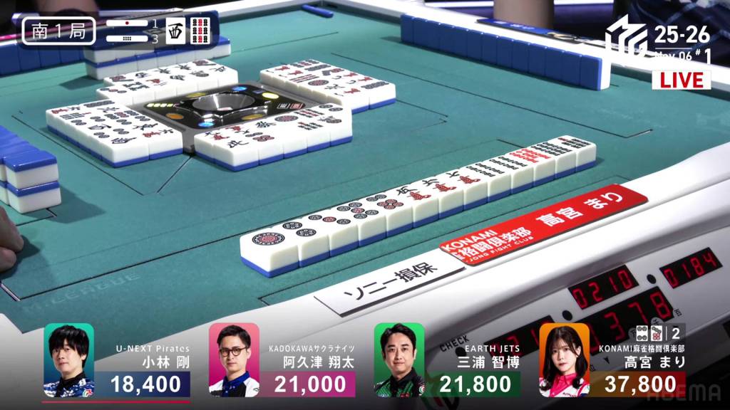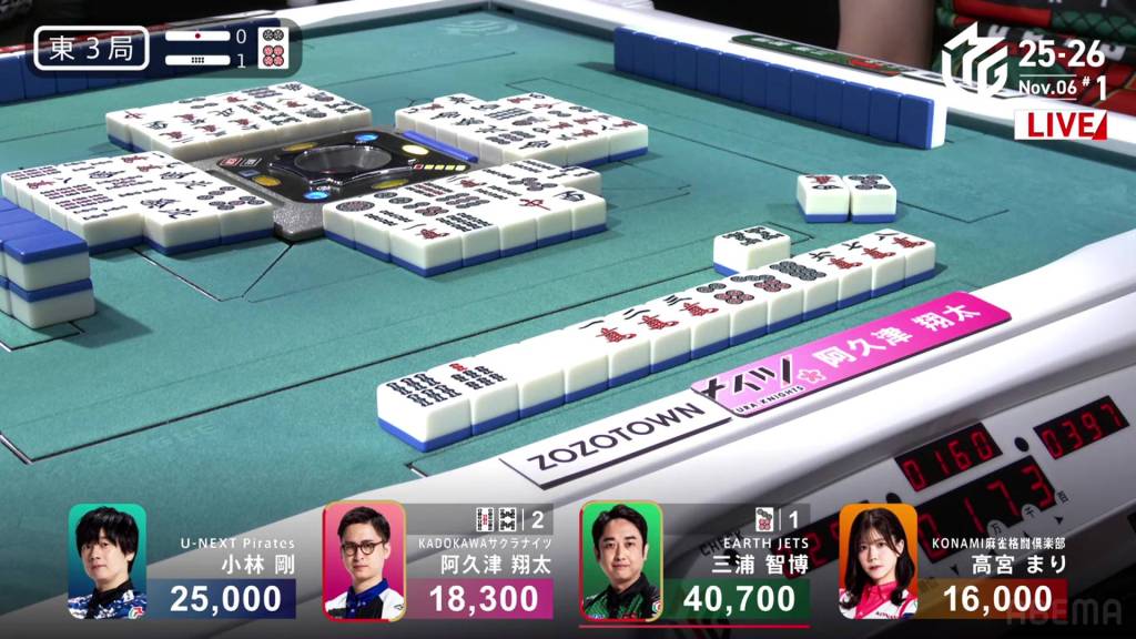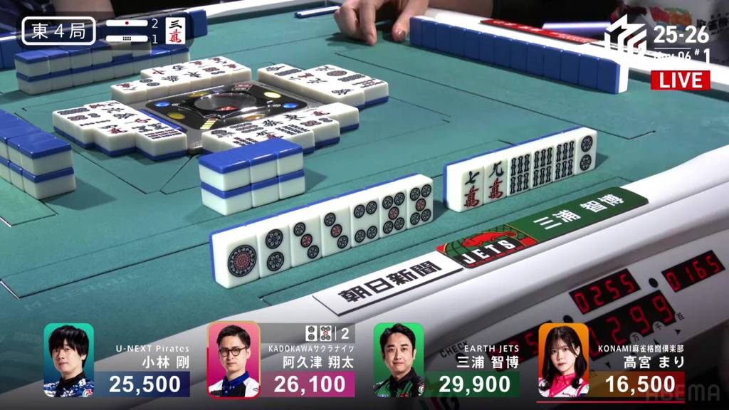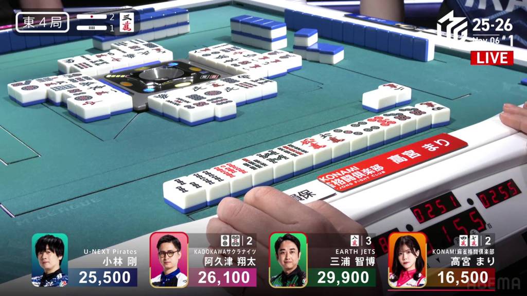 In E4-1, Takamiya is the dealer in 4th place, but is just 13,400 behind 1st place Miura. With a single mangan tsumo, Takamiya can move into 1st. Two riichi sticks sit in the middle.