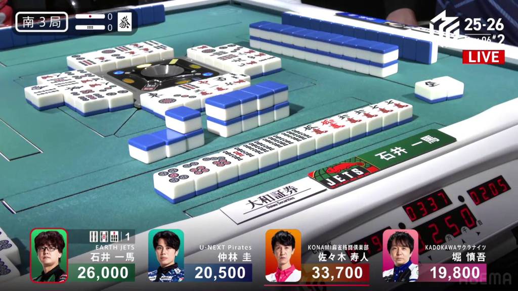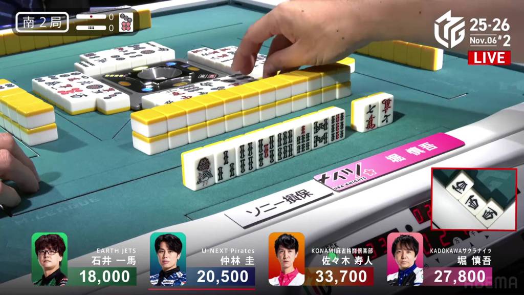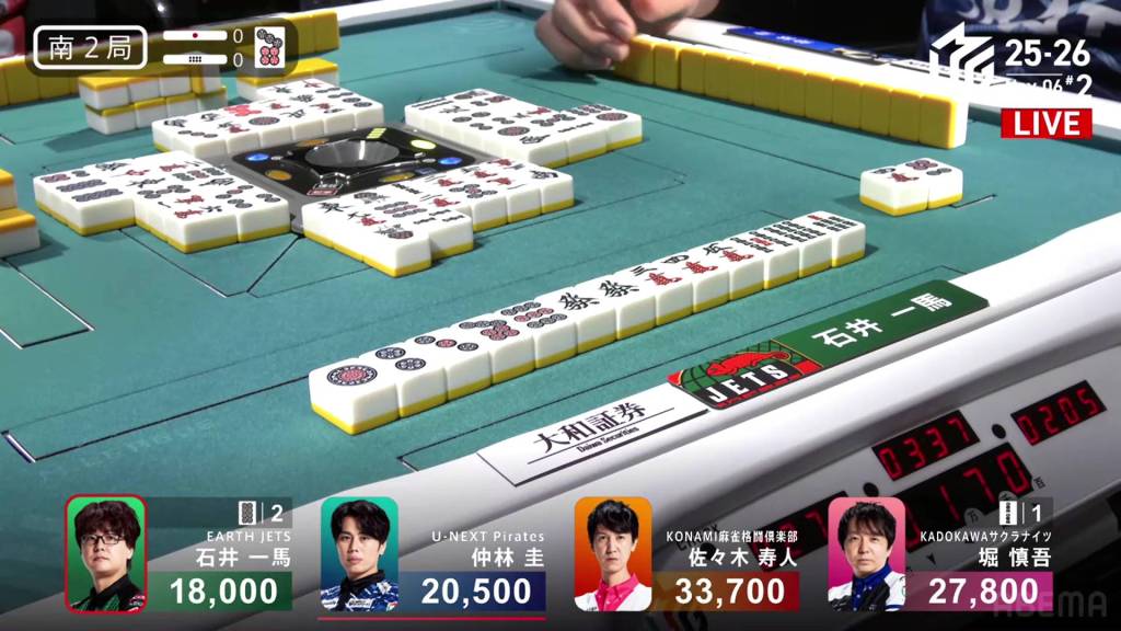 To Kazuma’s left, Hori is iishanten with a west triplet and a 2s away from a souzu straight. Making a 7m pair at the end of the second row, Hori gets to tenpai and waits on a 2s kanchan.