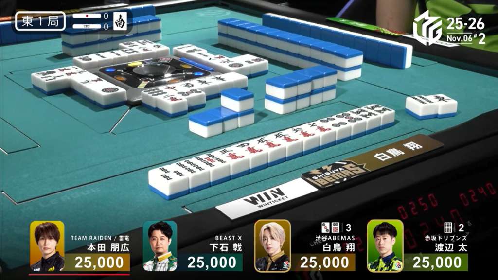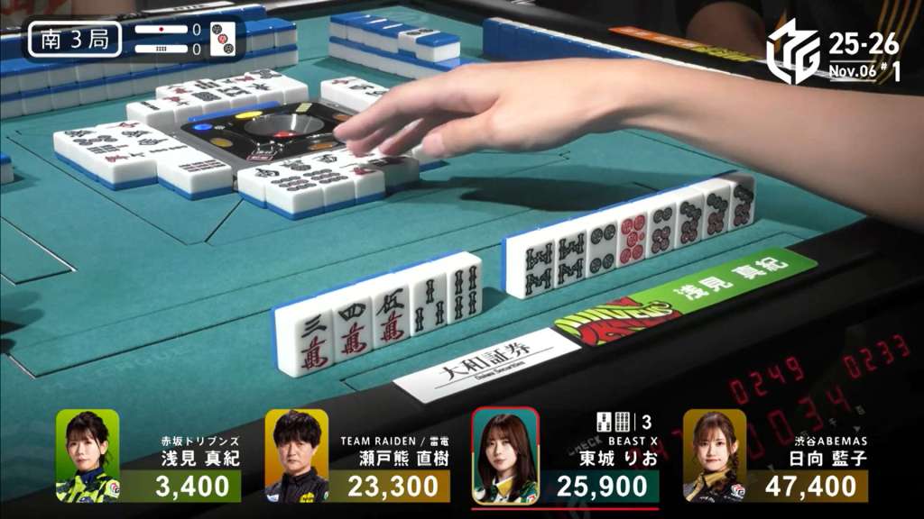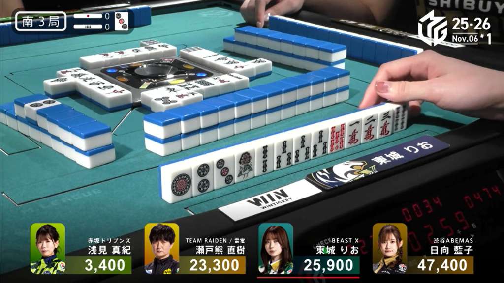 In S1-3, Takamiya is in 1st place and wants to keep it going. One riichi stick is available for the next winner.