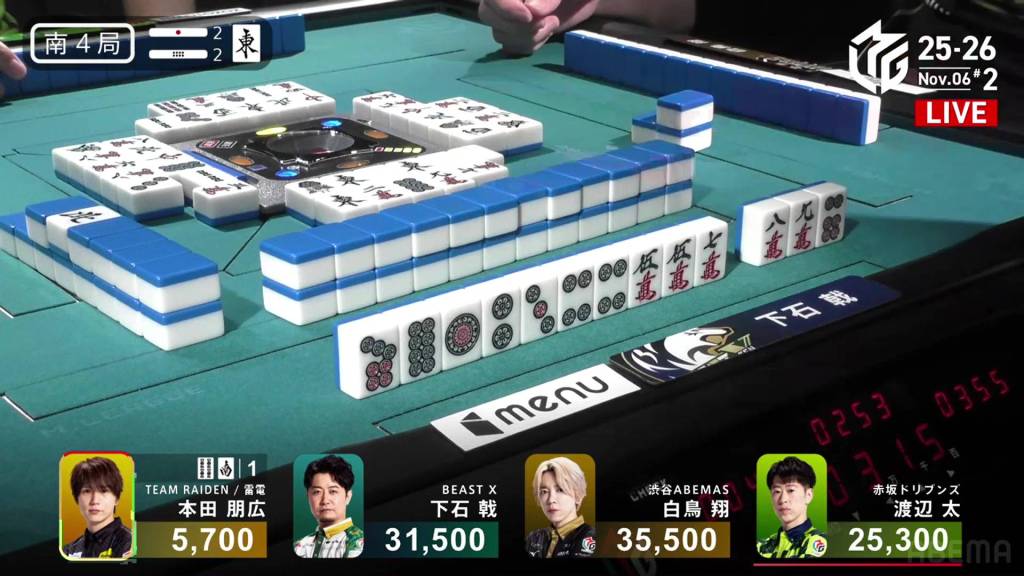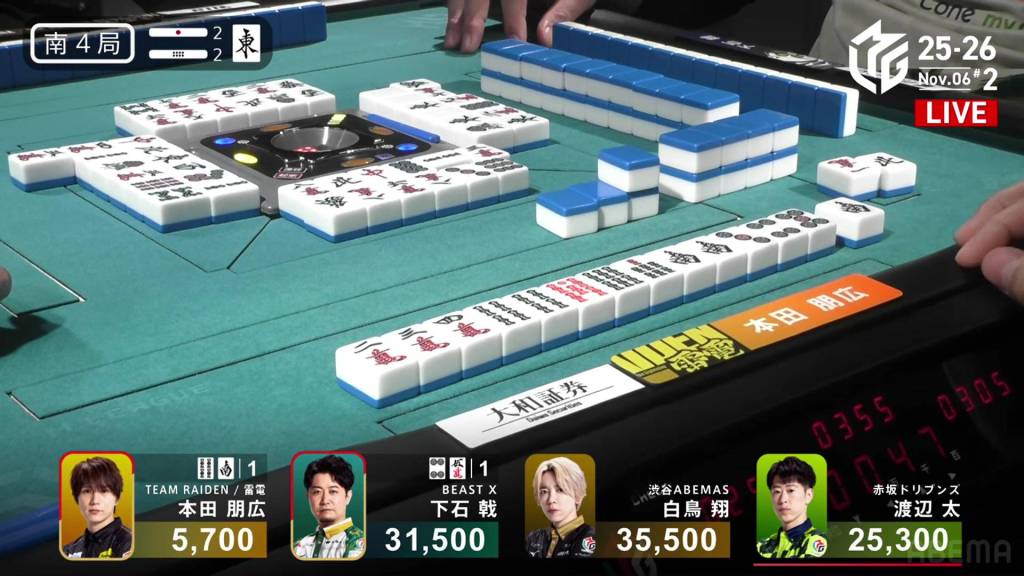 In S4-2, Honda is in 4th place and is 19,500 behind 3rd place Futoshi. It’s a lofty task, but with two riichi sticks and two honba, Honda needs a haneman direct hit or tsumo, or a sanbaiman ron to move up.