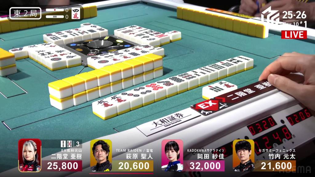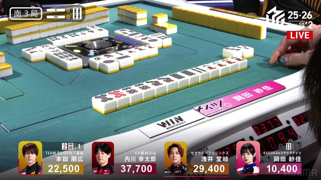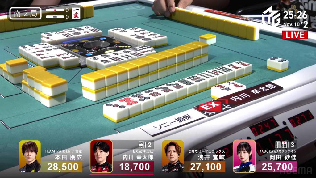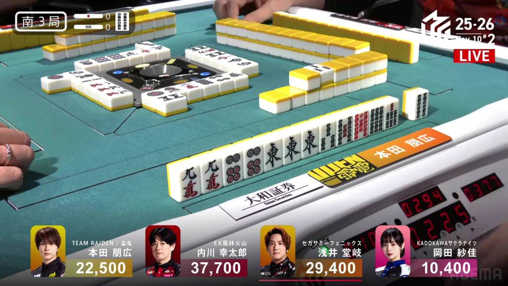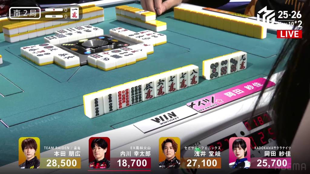 In S2-0, Uchikawa is the dealer in 4th place after getting hit with a surprise mangan the previous hand. However, he is just 9,800 from 1st place, putting him within a dealer mangan of taking the lead.