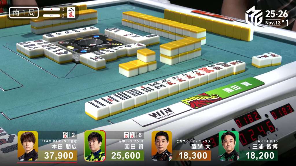 In E2-1, Takizawa is in 1st place and has a 7,000 lead over 2nd place dealer Yu. 1,300 in bonuses will go to the next winner.