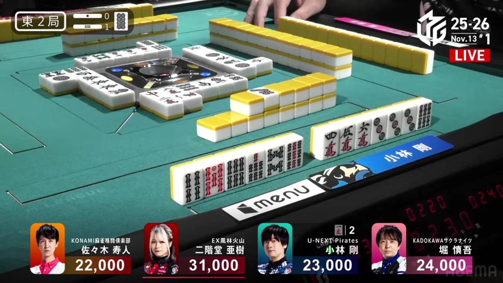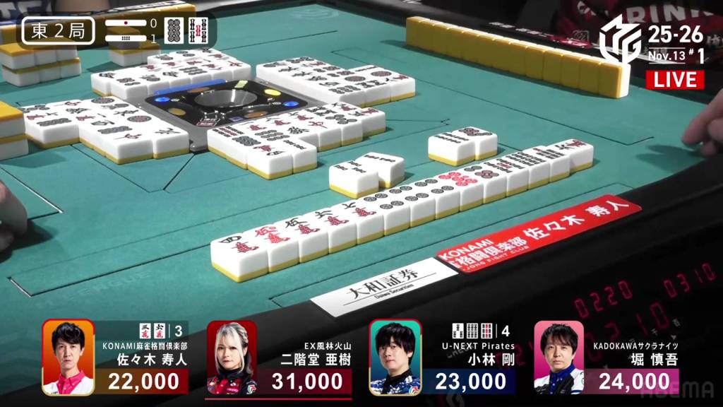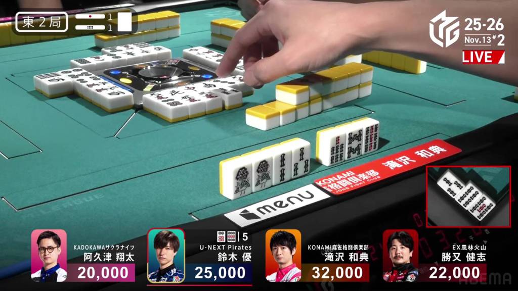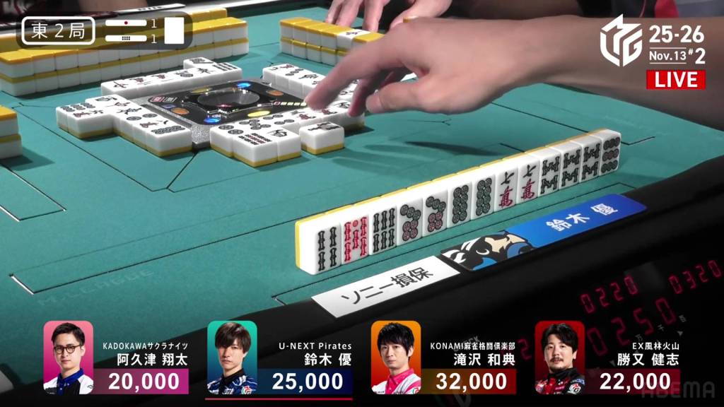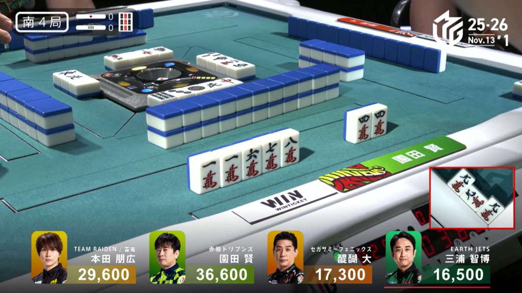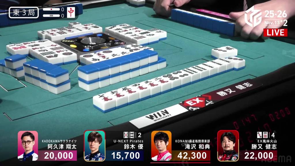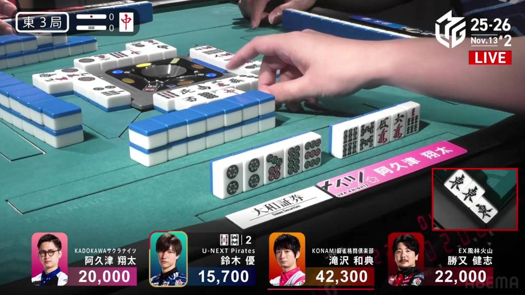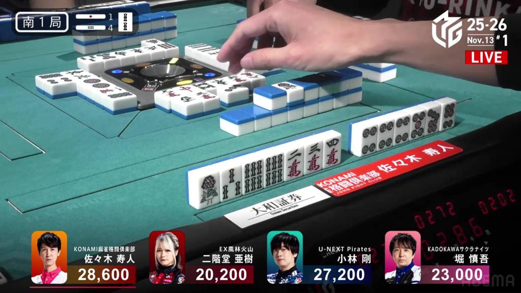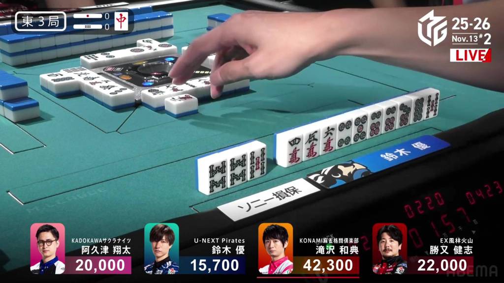 Within the go-around, Akutsu gets to tenpai on a 47m ryanmen.