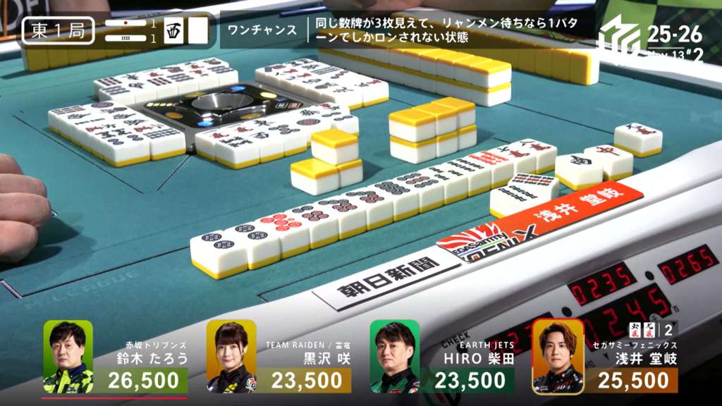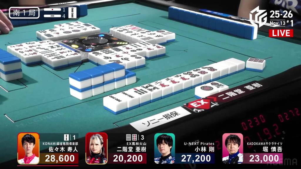 In E1-1, Takaki is in 2nd place and just 1,000 from the lead. With a riichi stick and a honba in the pot, any win is enough to move up.