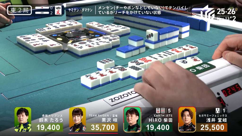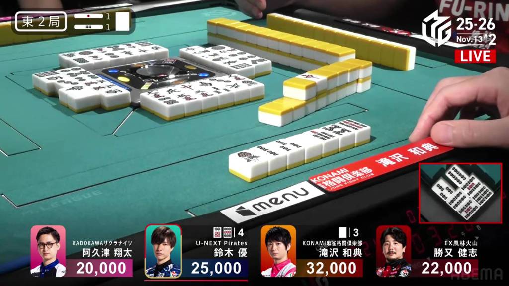 Despite the good wait, Katsumata isn’t the first to tenpai. On Yu’s turn, he gets to tenpai and calls riichi on a 5s/8s shanpon.