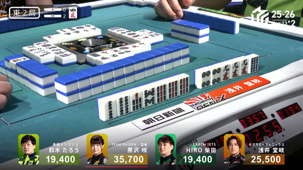 Sonoda has potential for wide waits, but he still holds onto the dora 2m for potential value. This hold ends up paying off as he draws the 2m dora on his next turn for tenpai. He calls riichi and waits on a 47m ryanmen, guaranteed at least a haneman if he wins. Honda challenges Sonoda by getting to tenpai in soon after, but he is unable to beat Sonoda. In the second row, Sonoda draws the 4m and wins the hand. Sonoda wins with Riichi/Tsumo/Pinfu/Tanyao/Dora 2/Aka 1 for 3,000/6,000, moving into 1st.