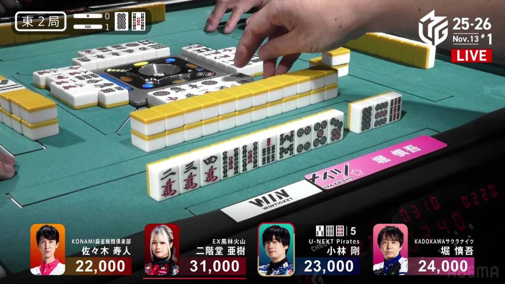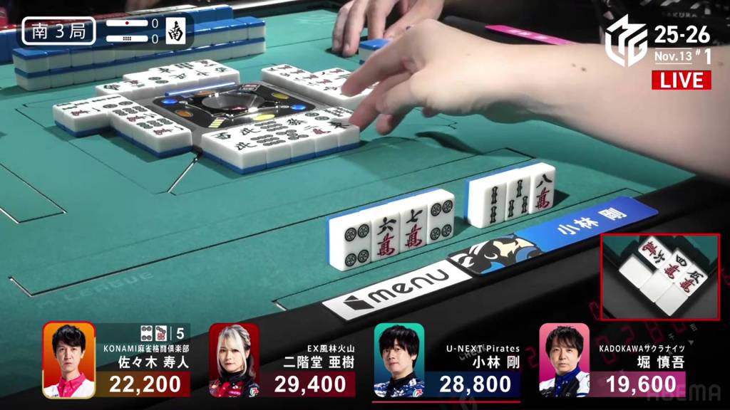 On Hori’s turn, he gets to tenpai and stays dama on a 36p ryanmen. After Kobayashi’s kan, Hori’s wait is now dead.
