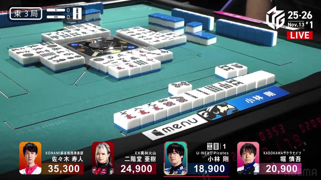 To his right, Takaki wants to put some difference between him and the bottom two. Soon after Shibata gets to iishanten, Takaki gets to tenpai and calls riichi on a 3s kanchan.