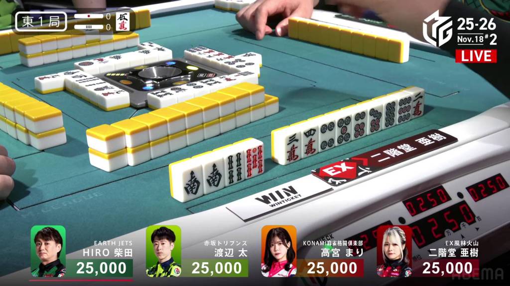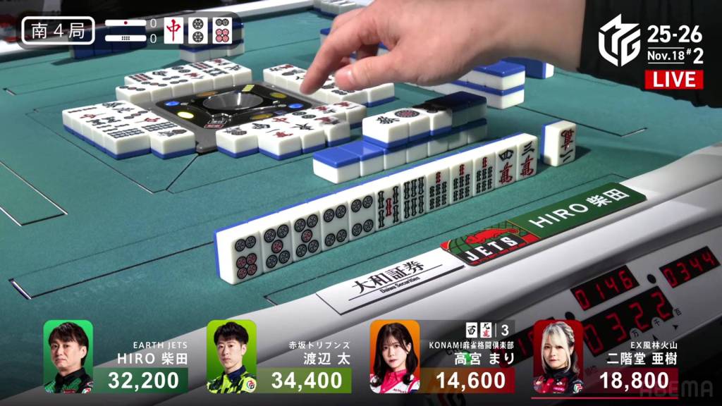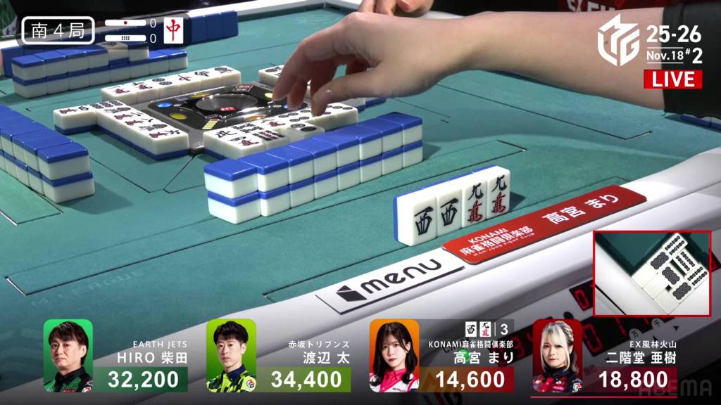 In S4-0, Takamiya is in 4th place and is 4,200 behind 3rd place dealer Aki. To move out of 4th, she needs a 2/40 direct hit, a 2/50 or 3/25 tsumo, or a 3/40 ron.