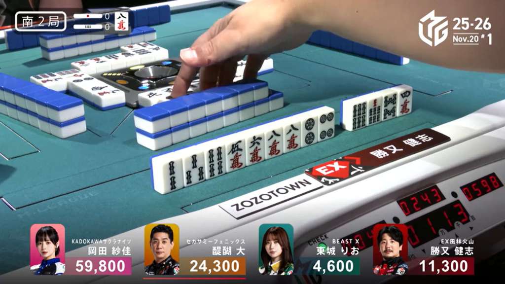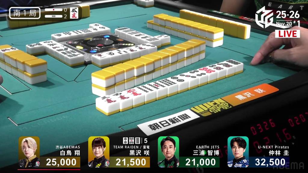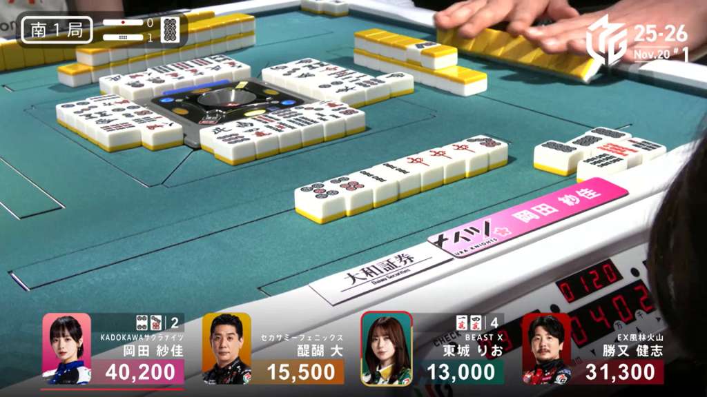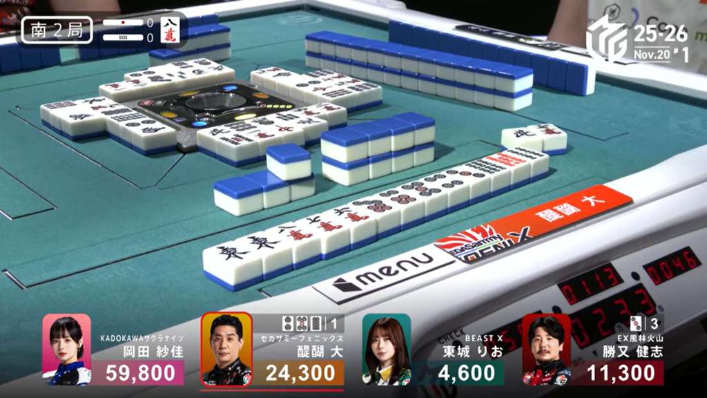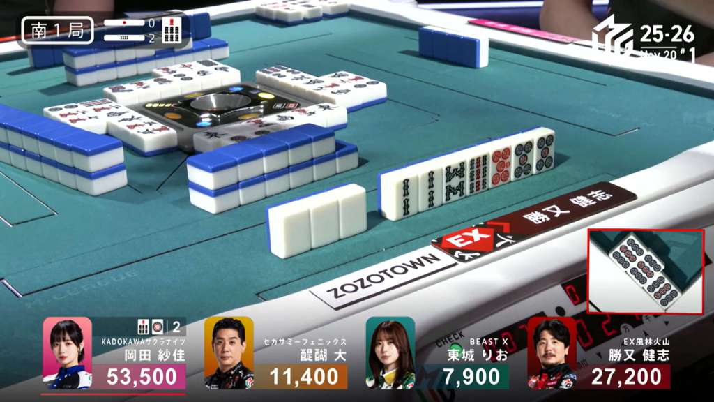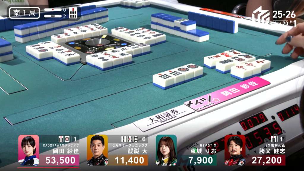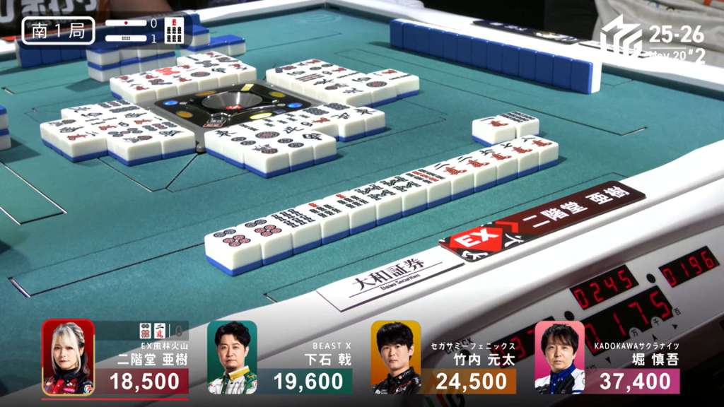 In S1-1, Okada is the dealer in 1st place with an 8,900 lead, having won a dealer mangan the previous hand.