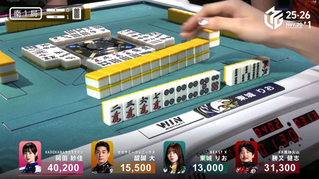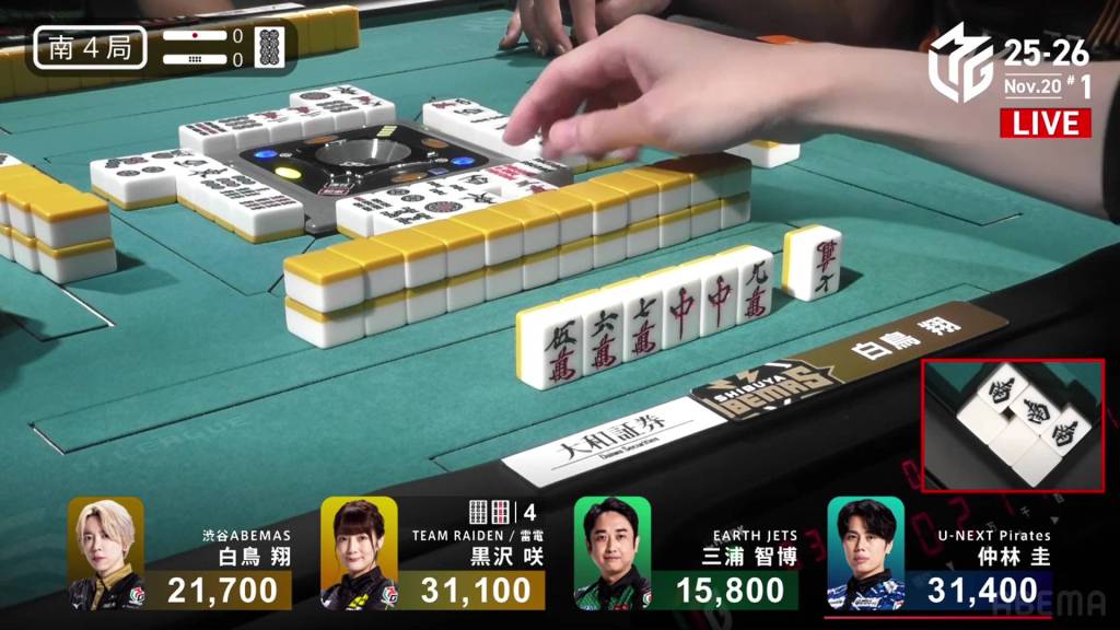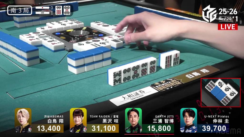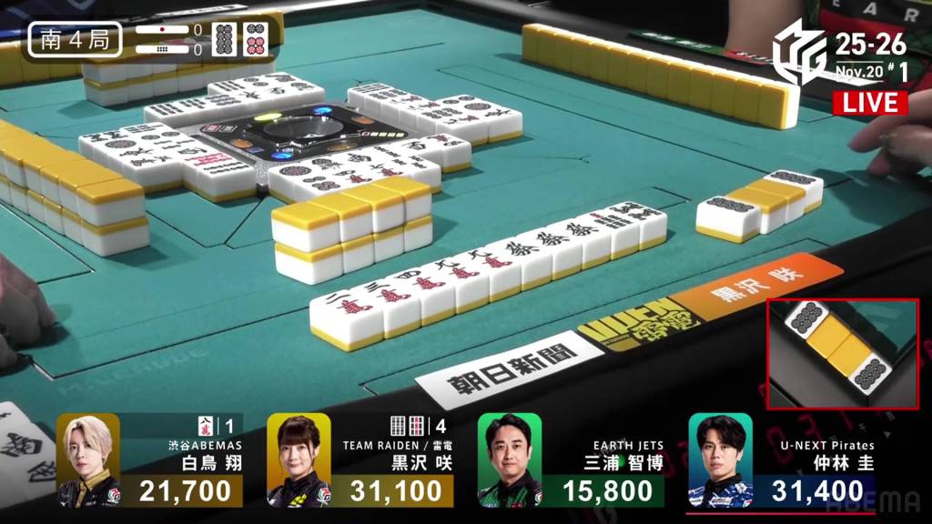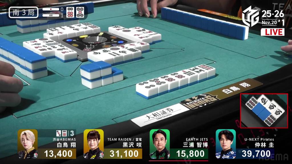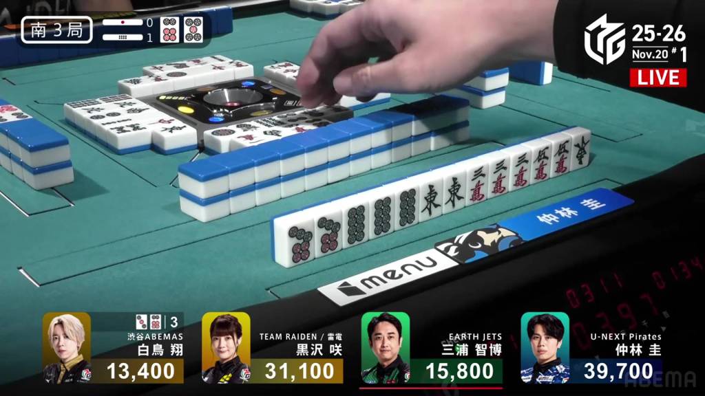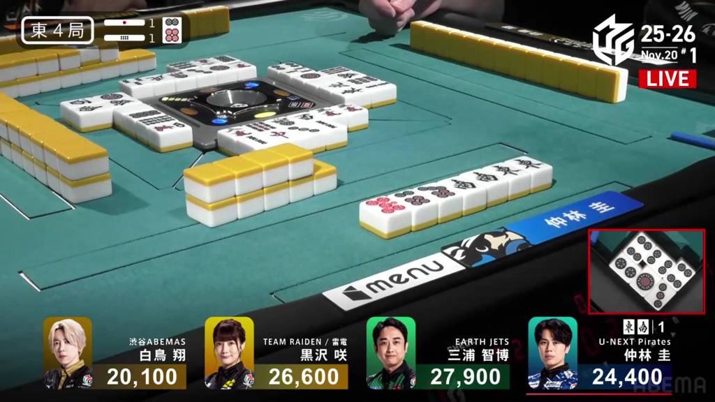 In E4-1, Nakabayashi is the dealer in 3rd place, just 3,500 from 1st place Miura. With a riichi stick and a honba in the pot, a 2-han hand will be enough to take top spot.