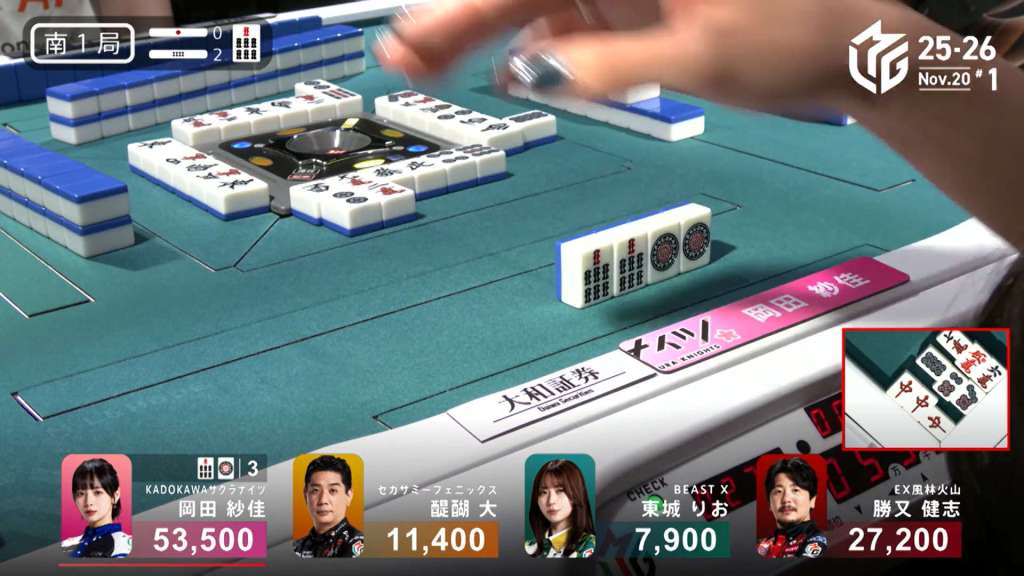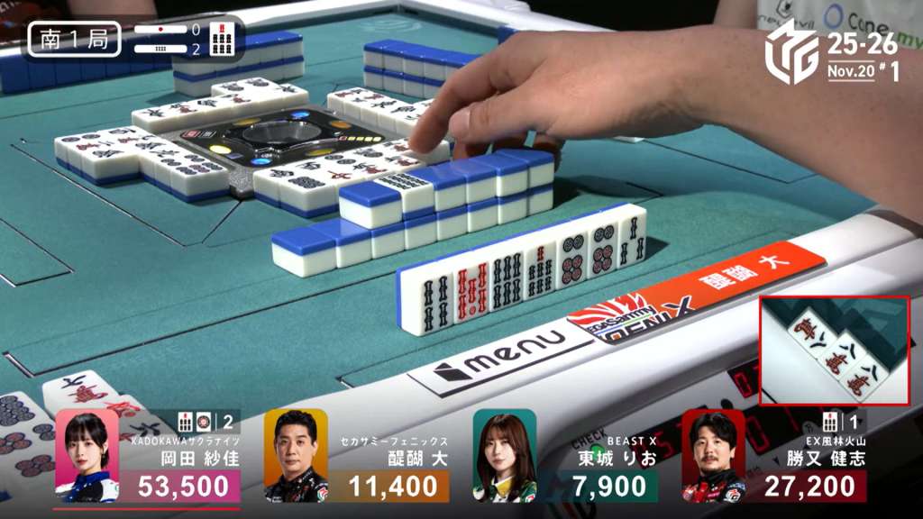 She isn’t the only player looking for 1st place, though. To her left, Shiratori has already called pon on the white dragon and the double south. With honitsu guaranteed and a possibility to call the red dragon for haneman, he has the value to get to 1st place. In the middle of the second row, he gets to tenpai and waits on an 8m kanchan, needing the mangan tsumo for 1st place.