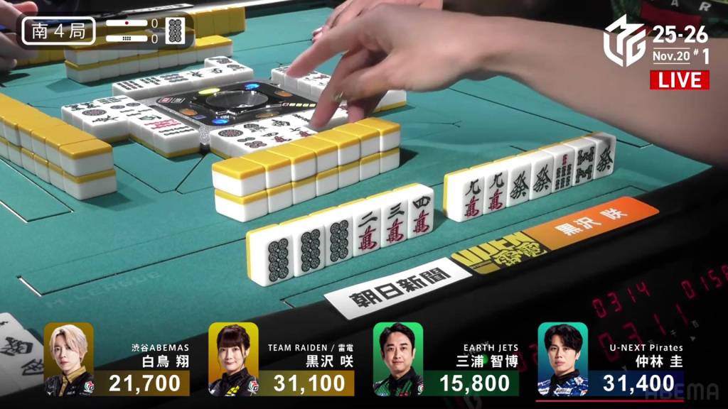 Kurosawa incredibly starts out at iishanten with her first draw, having a ryanmen and a three-sided wait, as well as the red 5p and the red 5m double dora secured. There is some action on the table with Nakabayashi calling pon on the white dragon and Miura on the red dragon, but Kurosawa’s speed is unmatched. At the end of first row, she fills in the ryanmen for tenpai.