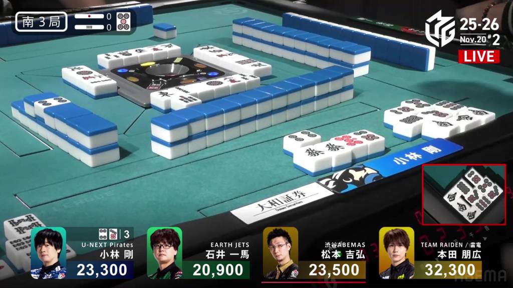 Across from him, 3rd place Katsumata wants to catch Daigo. At the start of the second row, Katsumata is the first to tenpai and stays dama on a 3p. A tsumo would put him within 1,000 of Daigo.
