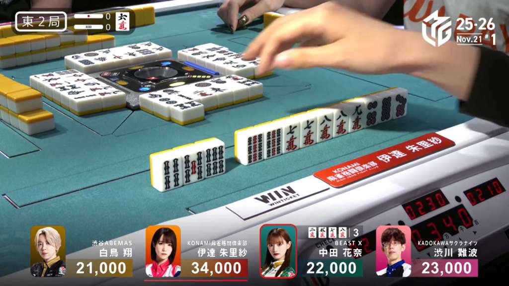However, Shibukawa and Date’s waits are exhausted, leaving Nakada as the only possible winner. On her second-last draw, she gets the 8m and wins the hand. Nakada wins with Riichi/Tsumo/Green Dragon/Dora 3/Aka 1 for 3,000/6,000 plus a riichi stick, moving into 1st.