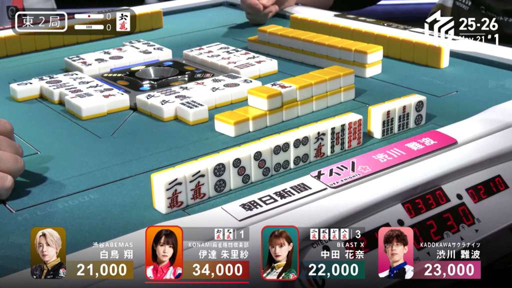 Sitting in 4th place is Mizuhara, 11,100 behind Takaki. Because of Takaki’s riichi, Mizuhara can win a mangan tsumo and move into 3rd place. And with the riichi, Takaki is vulnerable, unable to defend. Mizuhara tries ot move forward quickly, but the tiles don’t come too easily. Then, near the end of the second row, Mizuhara gets to tenpai and calls riichi on a 4p kanchan. If Mizuhara draws it herself and hits a booster, she will move up.