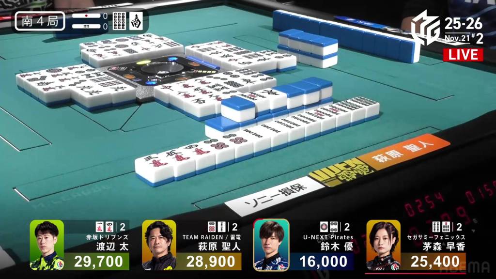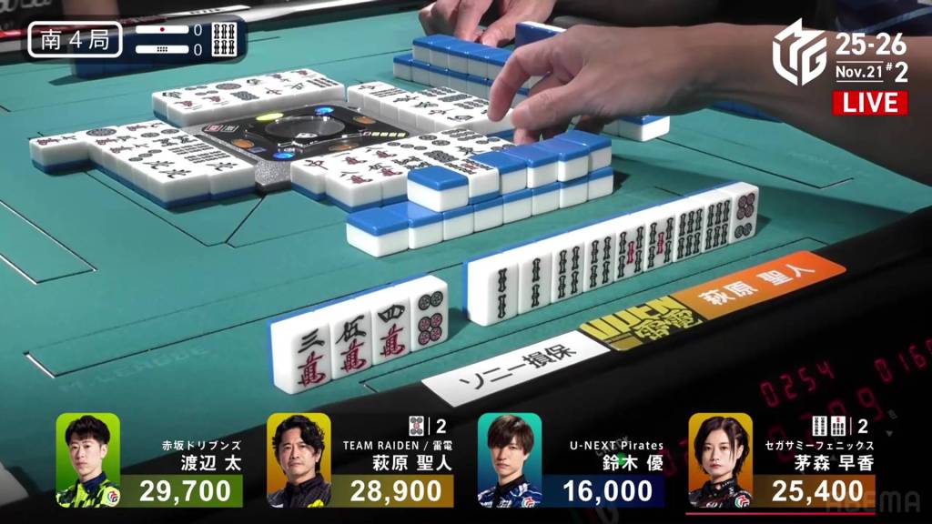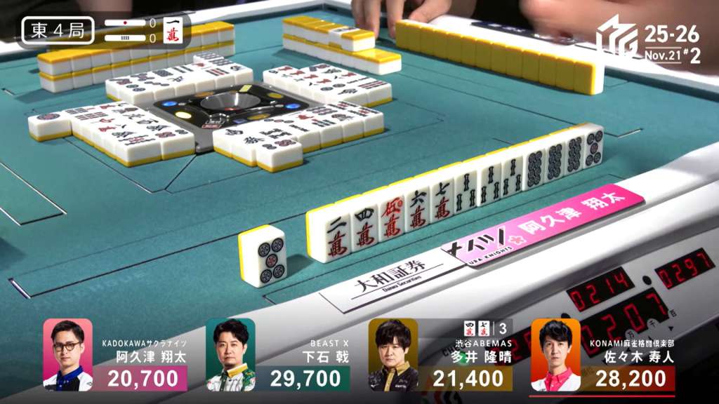 In S4-0, Shimoishi is in 2nd place and 1,100 behind 1st place dealer Hisato. Any win is enough so long as it’s not a 1/30 ron off Akutsu or Ooi.