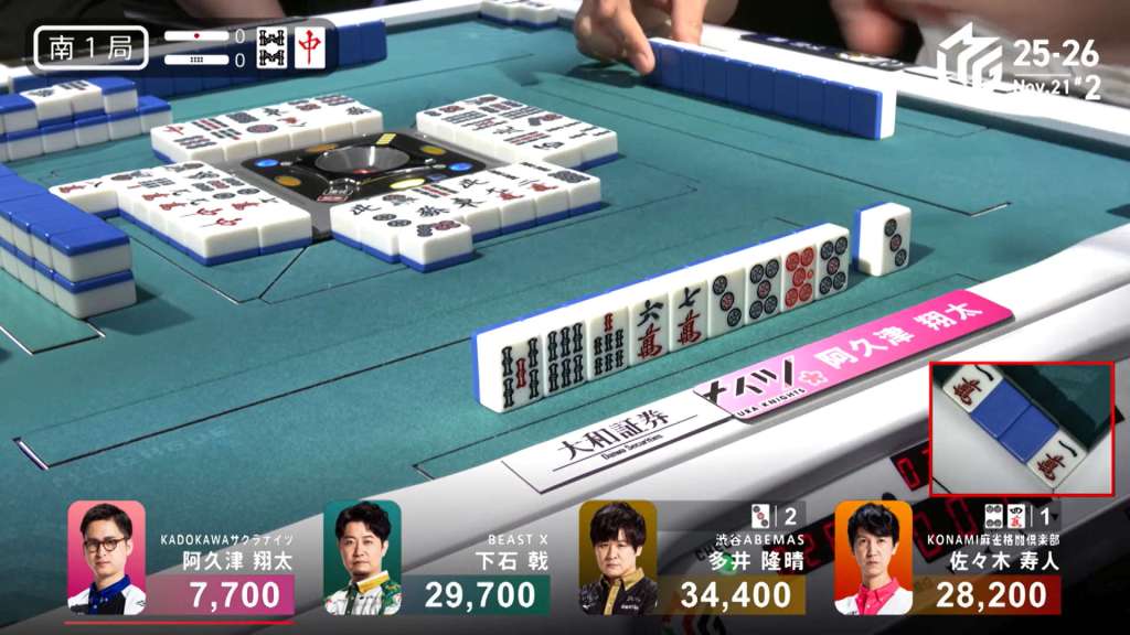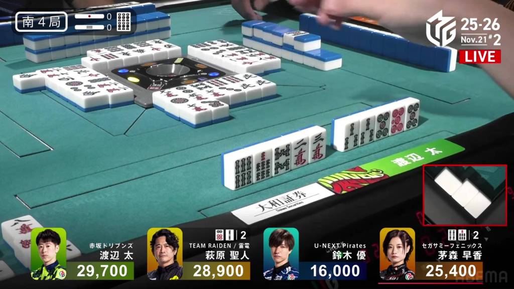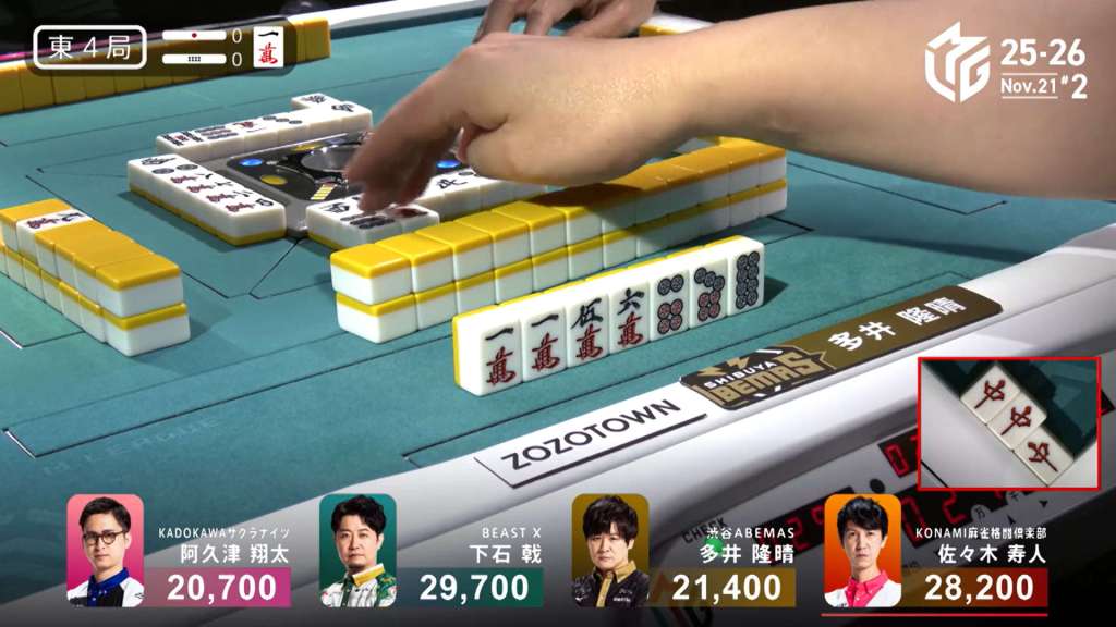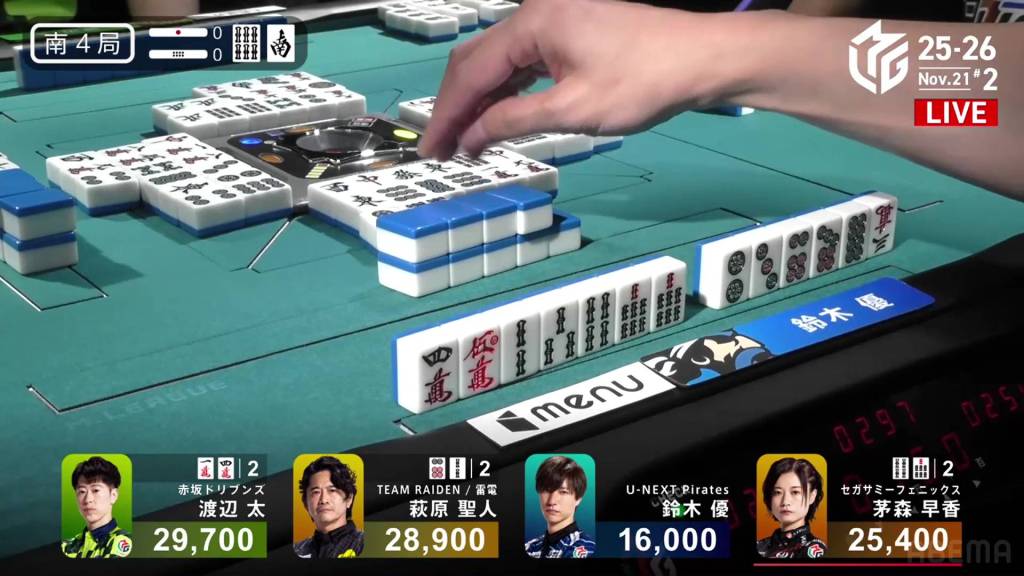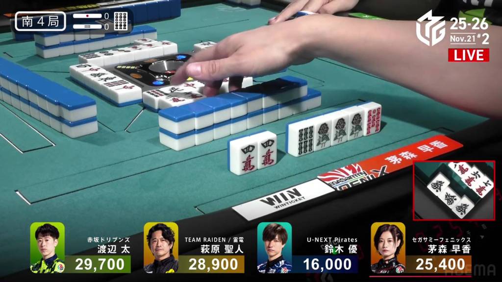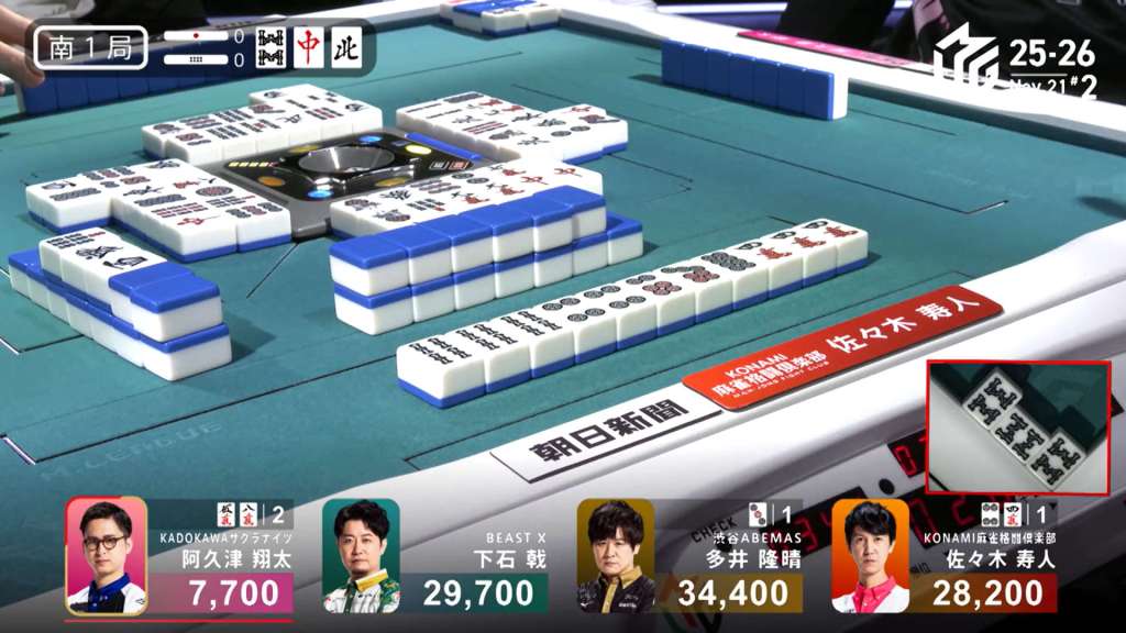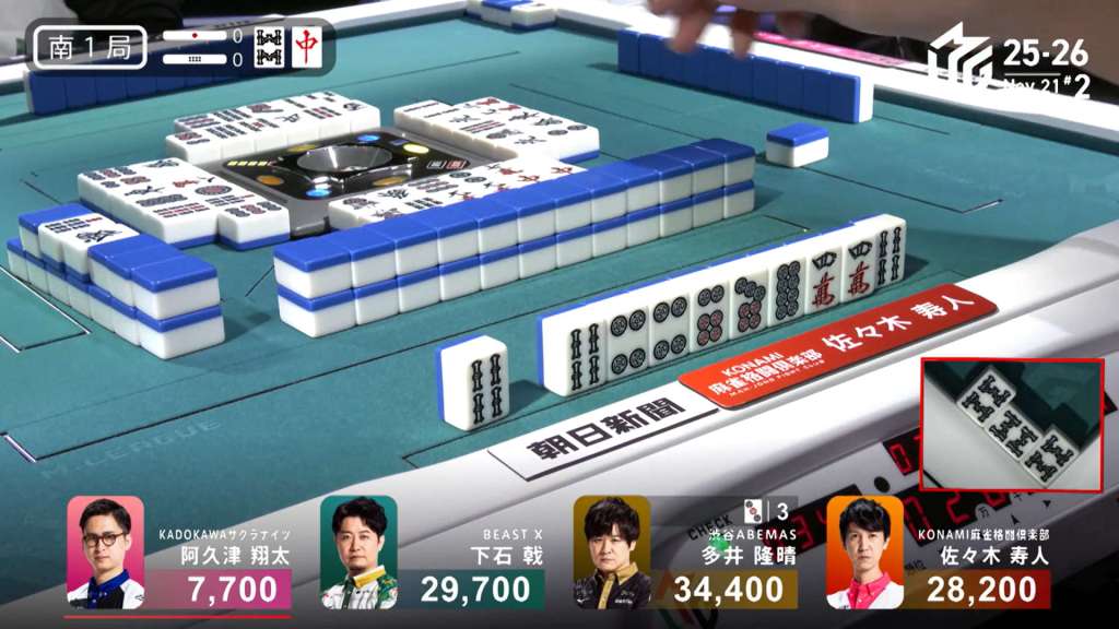 In S4-0, Takaki is in 3rd place, 5,000 behind 2nd place dealer Sonoda. To move up one rank, Takaki needs a 2/40 direct hit, a 3/30 tsumo, or a 3/40 ron. However, if he wants to aim even bigger and try to pass 1st place Setokuma (who is 15,300 ahead), he would need a mangan direct hit, or a baiman ron or tsumo.
