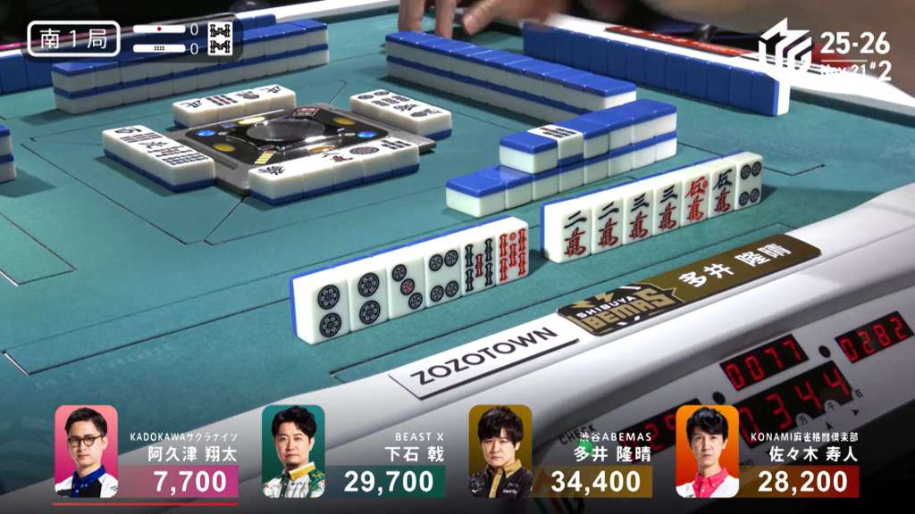 With Ooi holding a valuable hand, he doesn’t back down. In fact, Ooi adds even more potential value by creating a 456 sanshoku possibility, needing that 4m for a haneman. There is a small scare with Hisato calling a concealed kan on the east and revealing it as the new kandora, but Ooi isn’t afraid for long as Akutsu discards the 4m and deals in. Ooi wins the hand with Red Dragon/Sanshoku/Dora 2/Aka 2 for 12,000 plus a riichi stick, jumping up to 1st.