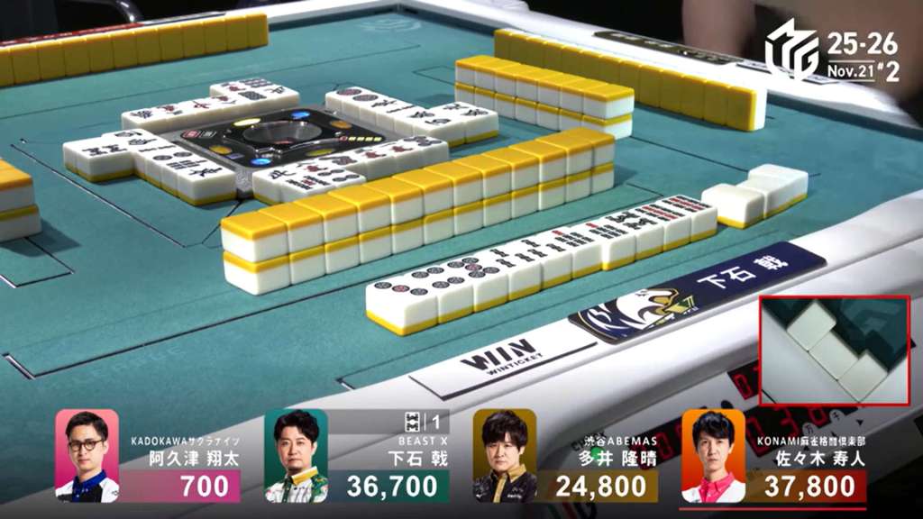 Across the table, 4th place Akutsu is iishanten with a secured red 5m. After making a triplet of 3s and pairing up the 5p, Akutsu gets to tenpai and calls riichi on a 3m kanchan. Unfortunately, none remain in the wall.