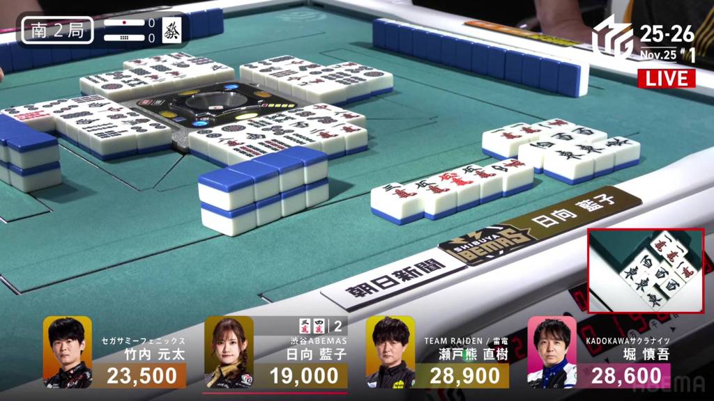 In S2-0, Hinata is the dealer in 4th place, but is just 9,900 from 1st place.