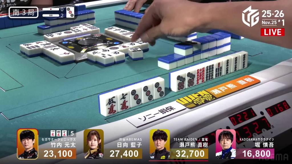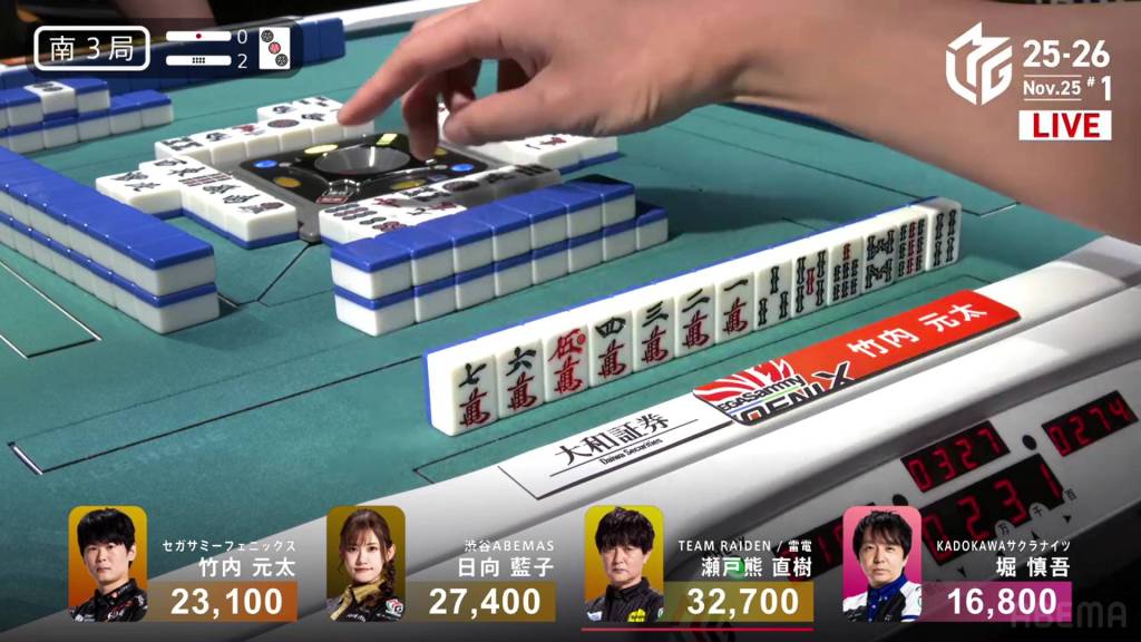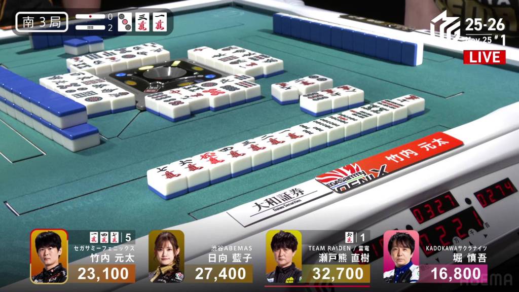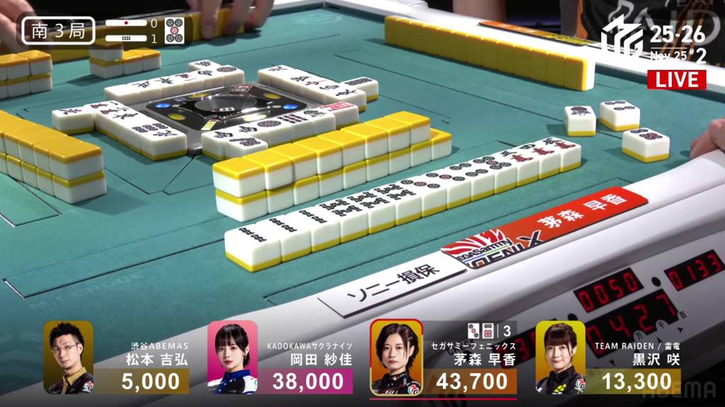 In S3-1, Kayamori is the dealer in 1st place and holding a 5,700 lead over 2nd place Okada.