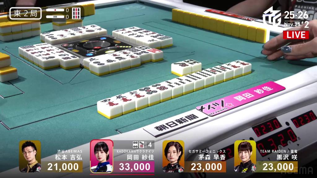 In E2-0, Okada is in 1st place after winning a mangan tsumo in the first hand.
