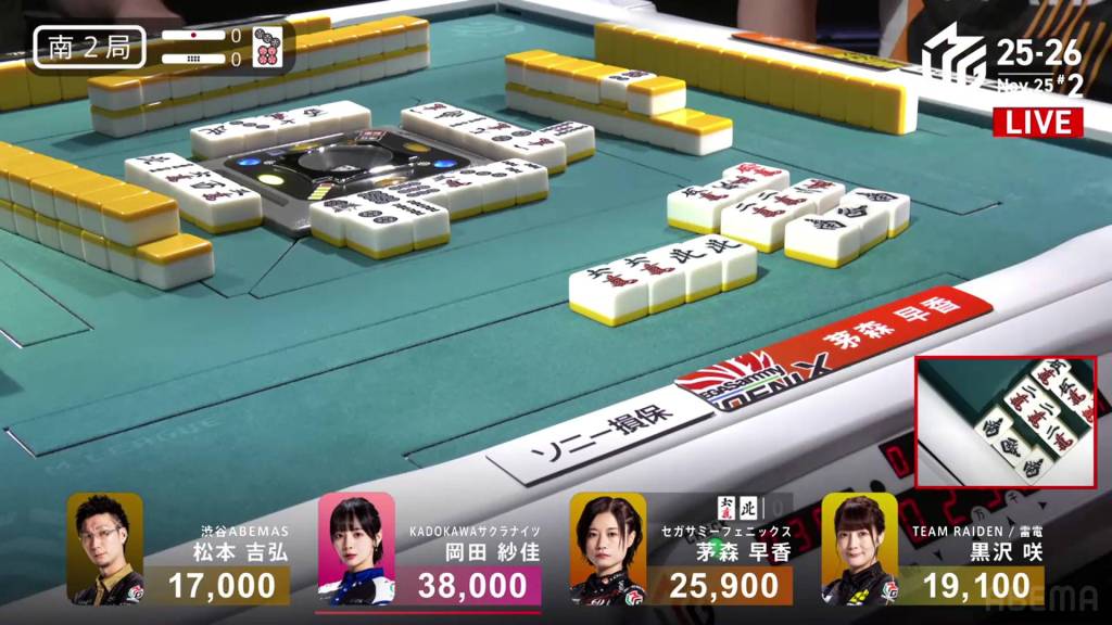 At the start of the second row, she calls pon on the 5m and gets to tenpai on a 6m/north shanpon. Just two turns later, Matsumoto discards the north and deals in. Kayamori wins with Toitoi/Honitsu/Double South/Aka 1 for 12,000, putting her just 100 shy of 1st place.