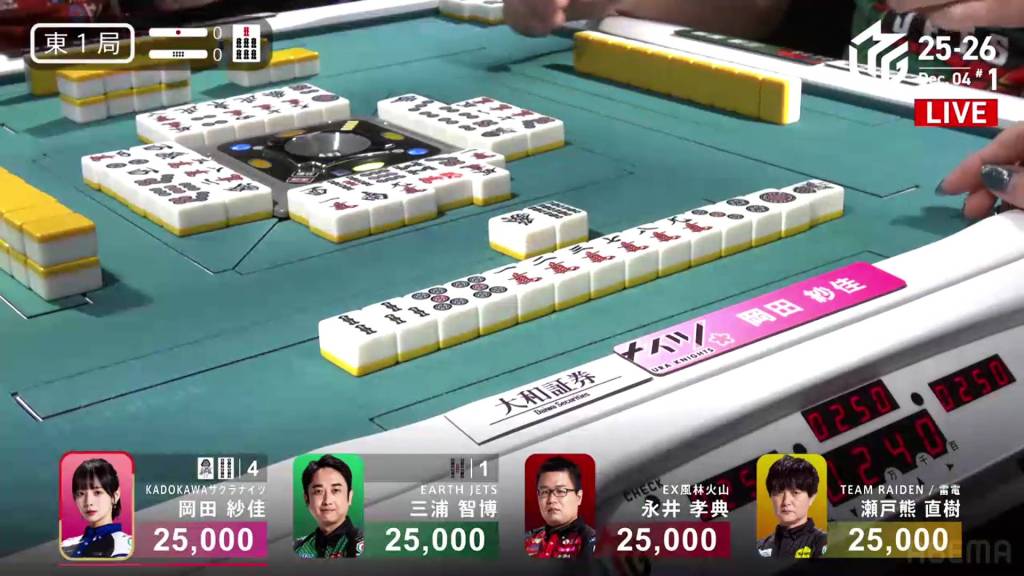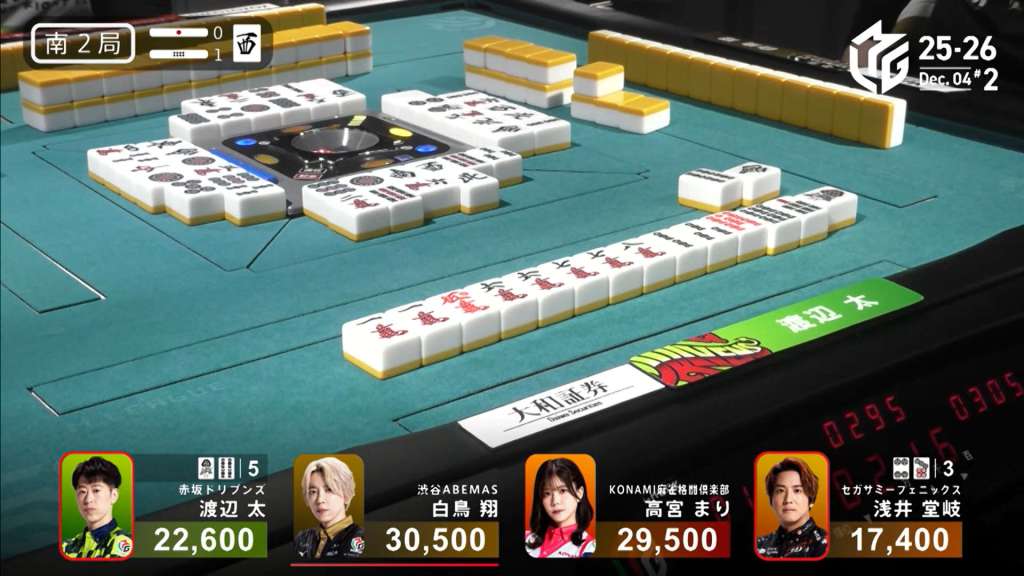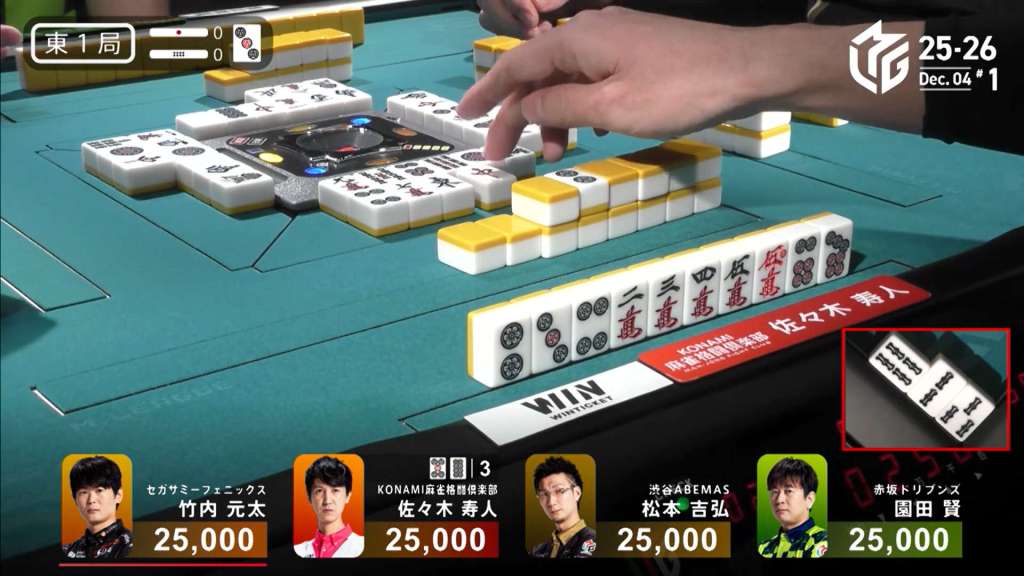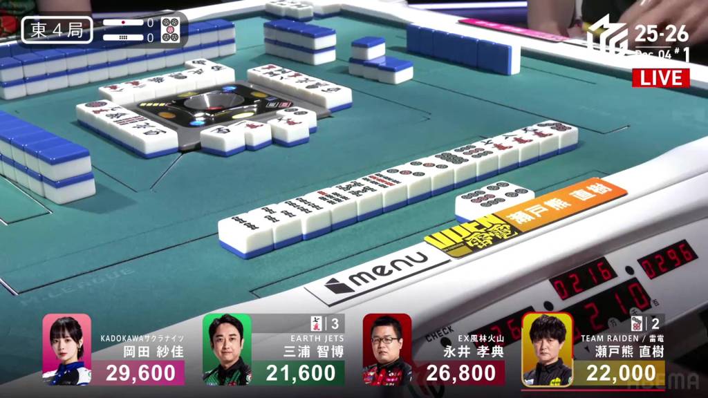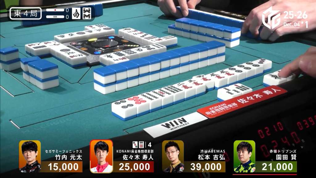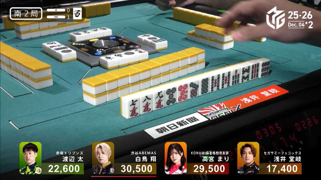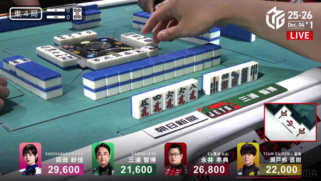 In the middle of the second row, Nakada fills in the 2p kanchan and calls riichi by throwing the red 5m. Miura gets to a yakuless tenpai two truns later, but it’s useless as Okada draws the 1s immediately after to win. Okada wins with Riichi/Tsumo/Pinfu/Sanshoku for 4,000 all.