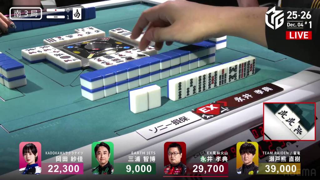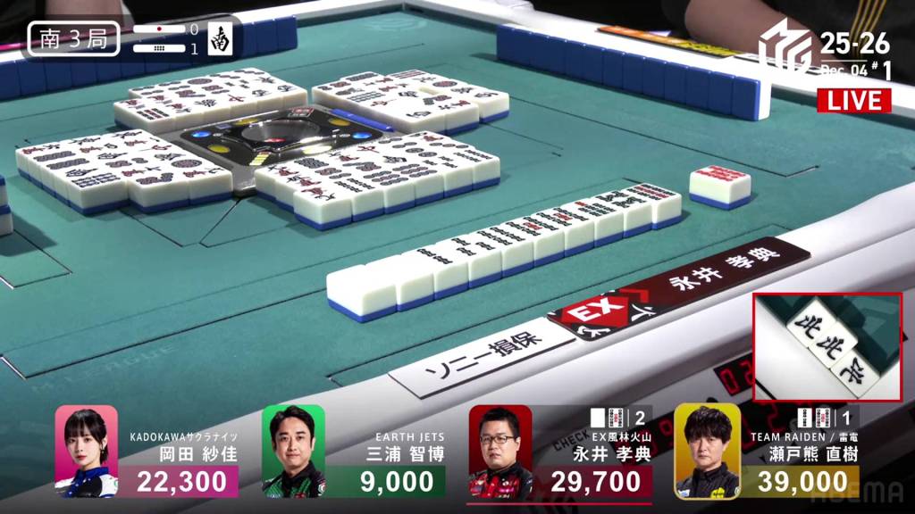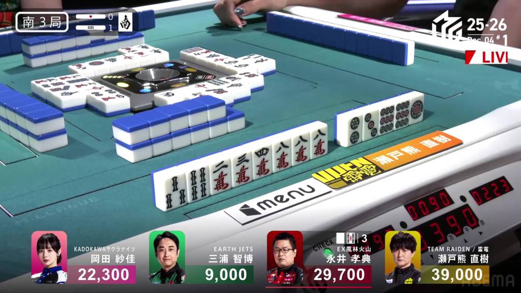 In S3-1, Nagai is the dealer in 2nd place, 9,300 behind 1st place Setokuma.