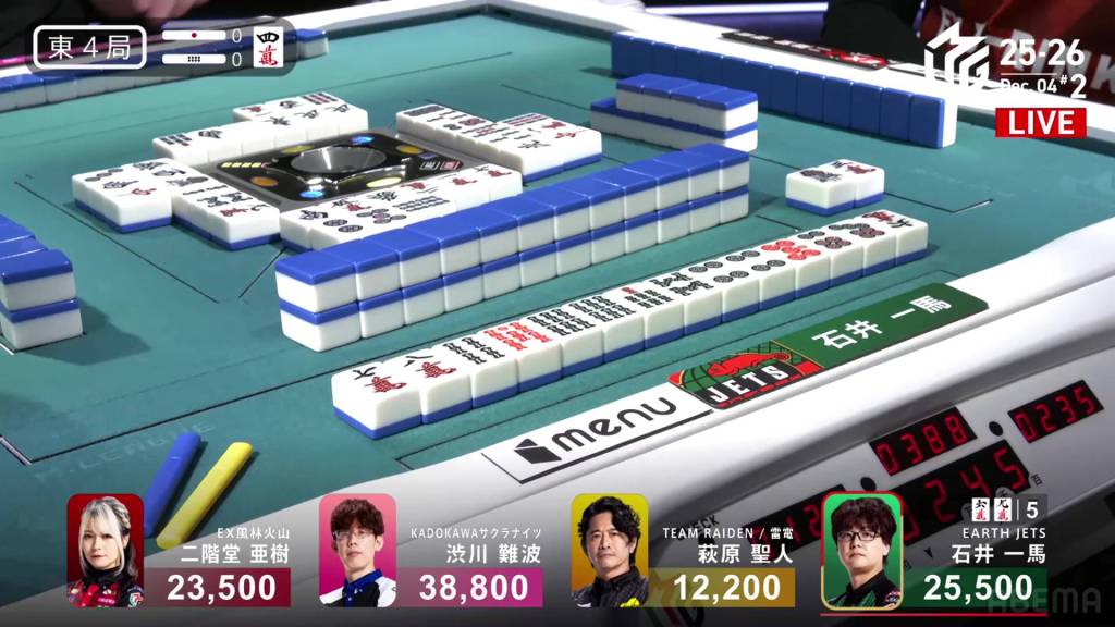 In E4-0, Kazuma is the dealer in 2nd place and 13,300 behind 1st place Shibukawa.