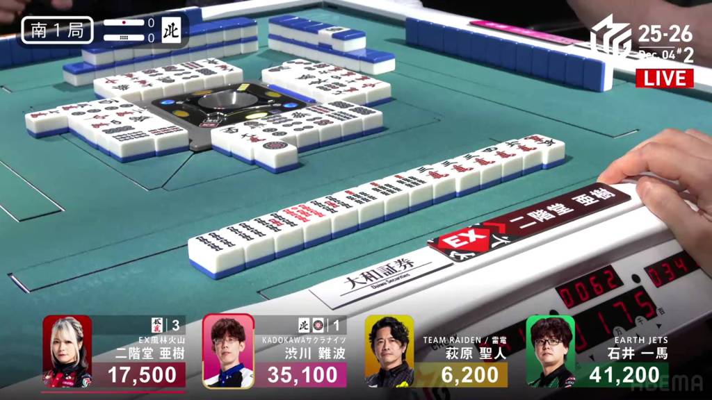 In S1-0, Aki is the dealer in 3rd plcae, 17,600 behind 2nd place Shibukawa and 23,700 behind 1st place Kazuma.