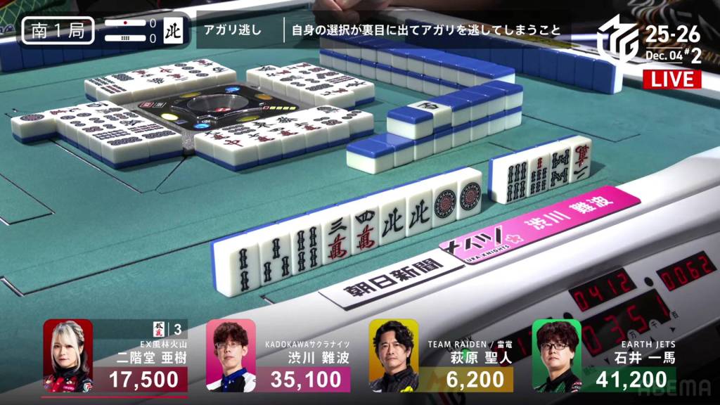 In E4-0, Hisato is back at startnig score after winning a mangan. He still has 14,000 to go to catch up to 1st place Matsumoto.