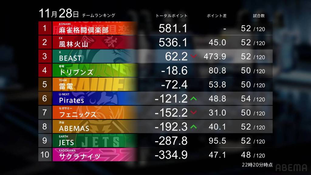 Earth Jets, Sega Sammy Phoenix, Shibuya Abemas, Beast X and U-Next Pirates all gained points as well. The Earth Jets managed to to get two 1sts (including Kazuma getting his 7th of the season) to inch their way closer to the chasing pack. The Sega Sammy Phoenix had two 1sts by Kayamori to push them up from 7th to 5th. The Abemas were able to avoid 4th place all week to put them within a 1st place of 5th place. The Beast X had a small scare of being in the negatives during the week, but a big 1st by Nakada and a 2nd by Shimoishi to end the week let them end the week with a net gain. And an even record by the U-Next Pirates cut it close, but a decent +66.6pts 1st place and +20.3pts 2nd place by Nakabayashi was the difference.