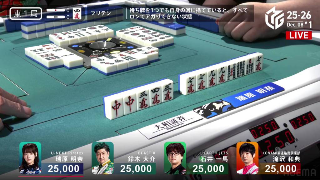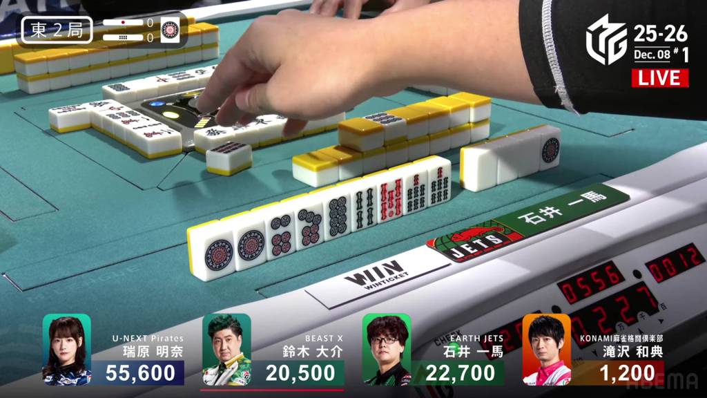 On Kazuma’s turn, he gets a red 5p and switches to a 47p ryanmen. Despite the two-sided wait, Kazuma’s winning tiles go down from 2 to 1.