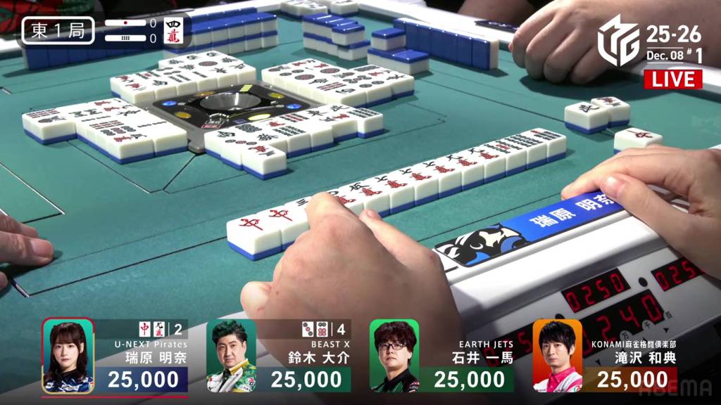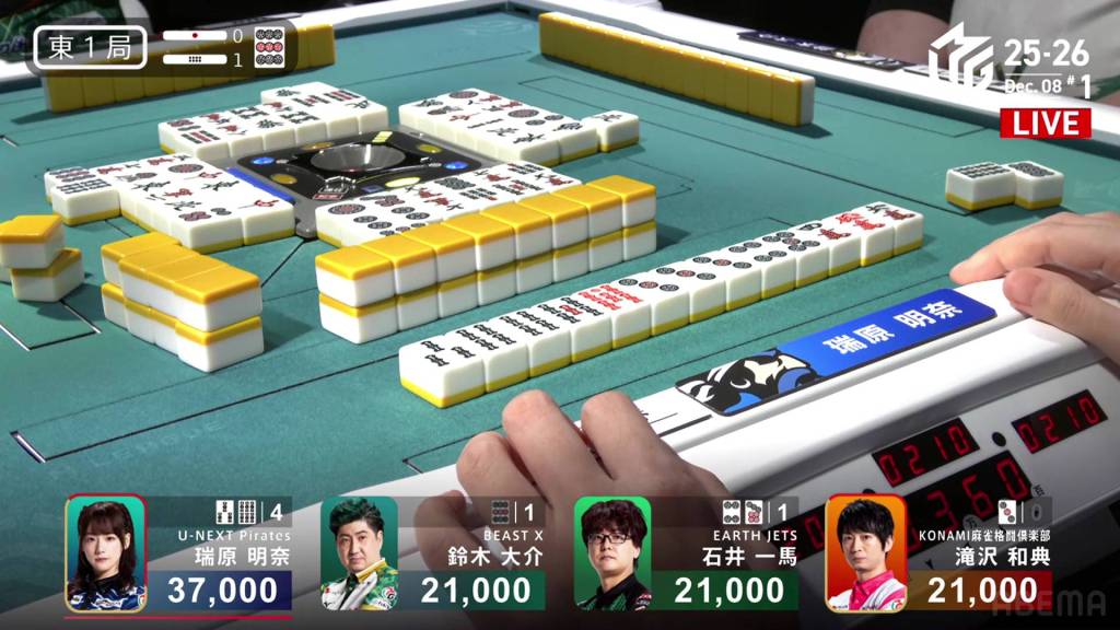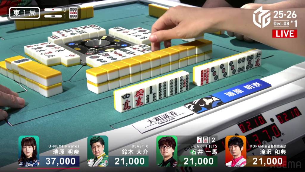 Two turns later, Mizuhara draws the red dragon and wins the hand. Mizuhara wins with Riichi/Tsumo/Red Dragon/Dora 1 for 4,000 all.