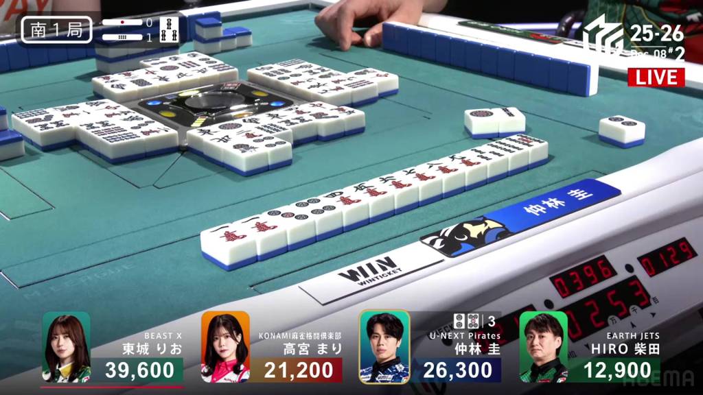 In the middle of the third row, Nakabayashi draws the 2p and wins the hand. With the 2p also being the uradora, Nakabayashi wins with Riichi/Tsumo/Pinfu/Dora 1/Ura 1 for 2,000+100/4,000+100, getting Nakabayashi within 900 of 1st place.