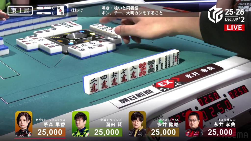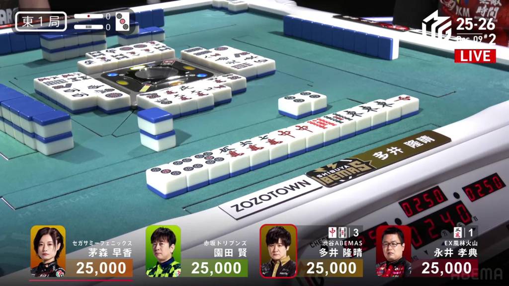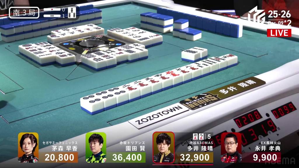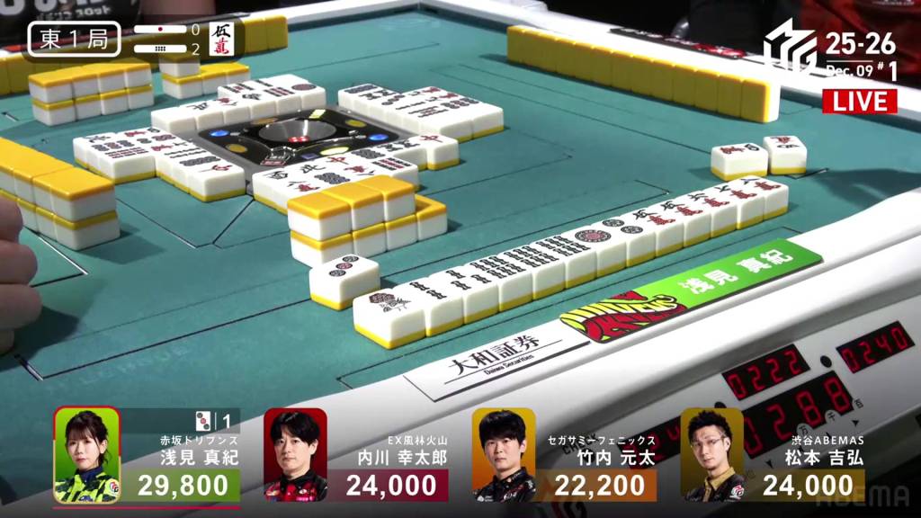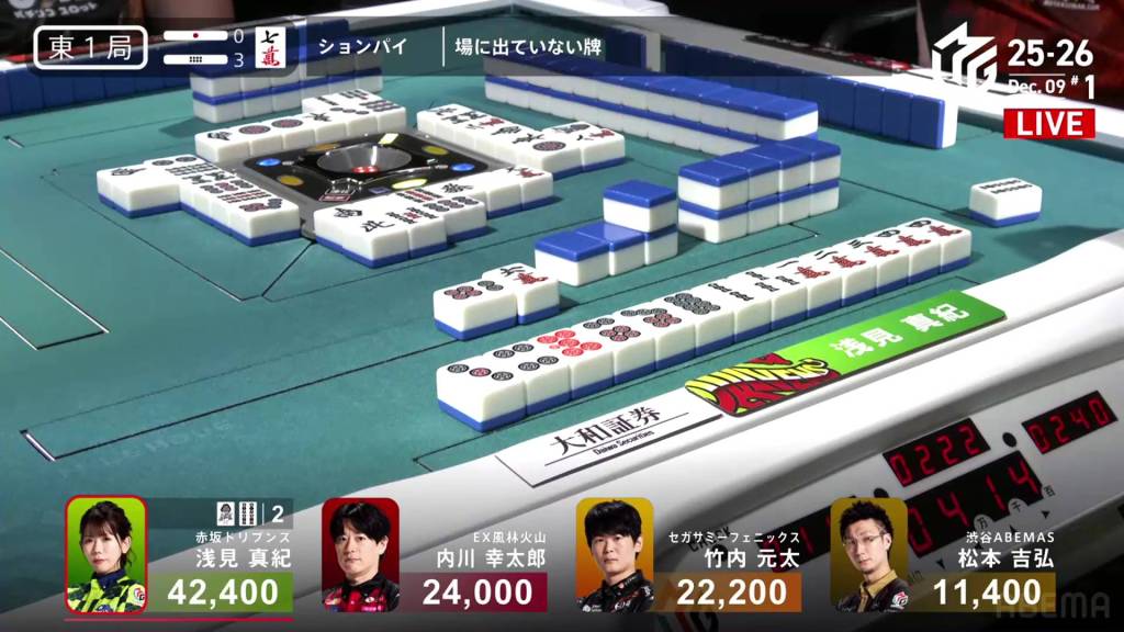 It’s a 1 vs. 1 battle between the two bottom players. In the third row, Matsumoto draws a fourth 2p and calls another concealed kan, but the east kandora and the rinshan don’t help. The kandora doees, however, boost Uchikawa up to a haneman minimum. On Uchikawa’s turn, he draws that final 9m and wins the hand. Though he doesn’t hit any uradora, Uchikawa wins with Riichi/Tsumo/Chiitoi/Dora 2/Aka 1 for 3,000+300/6,000+300, moving Uchikawa up to 2nd place.