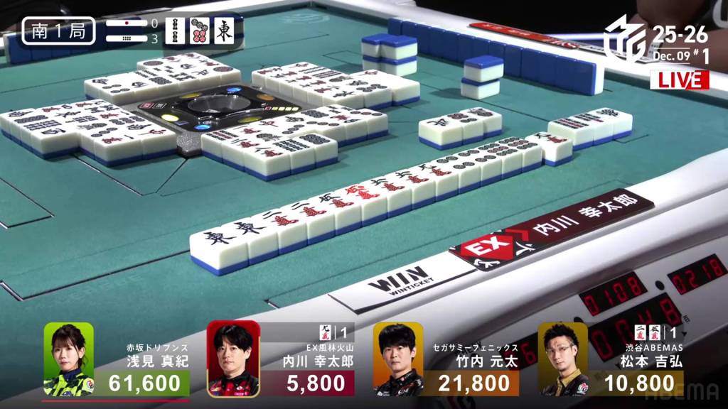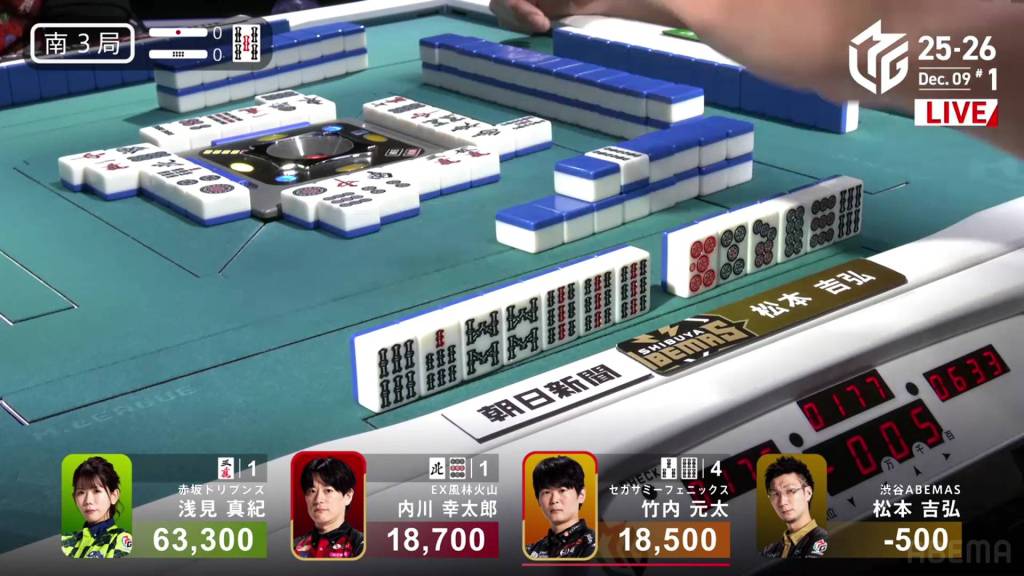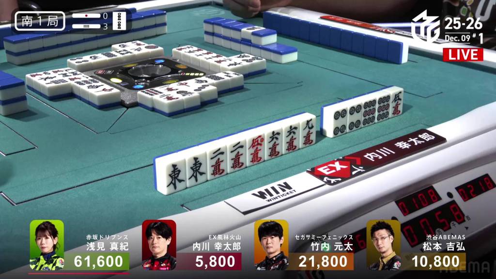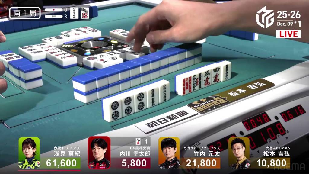With a bad wait and a big lead, Asami just decides to fold. In the middle of the second row, Uchikawa draws and discards the 3s and deals into Genta. Genta wins the hand with Riichi/Pinfu/Dora 1/Aka 1 for 12,000 plus two riichi sticks.